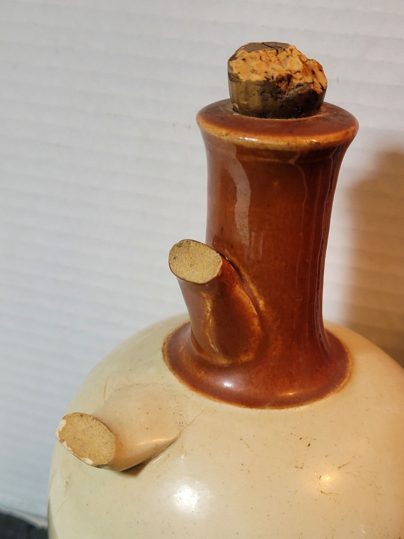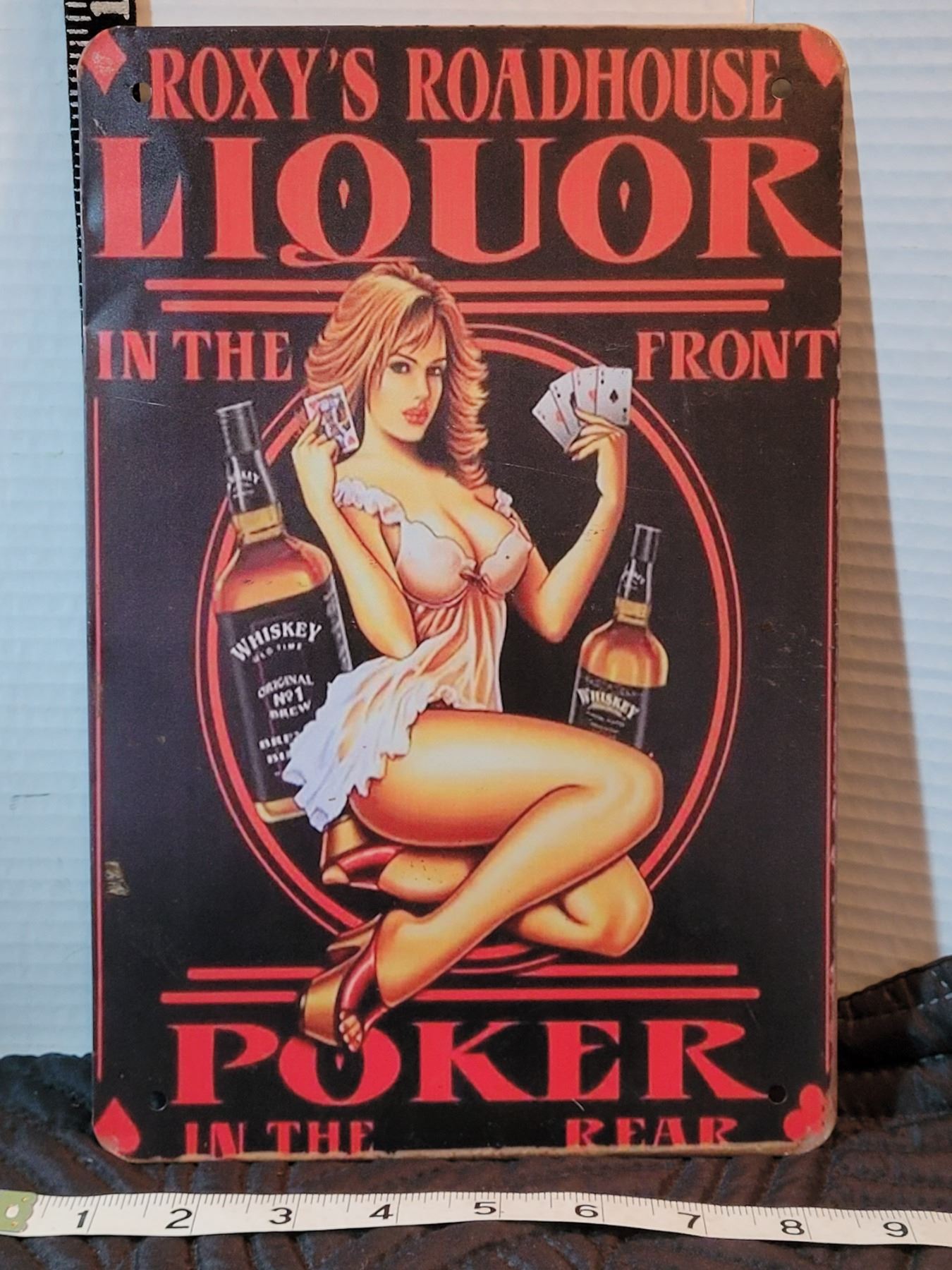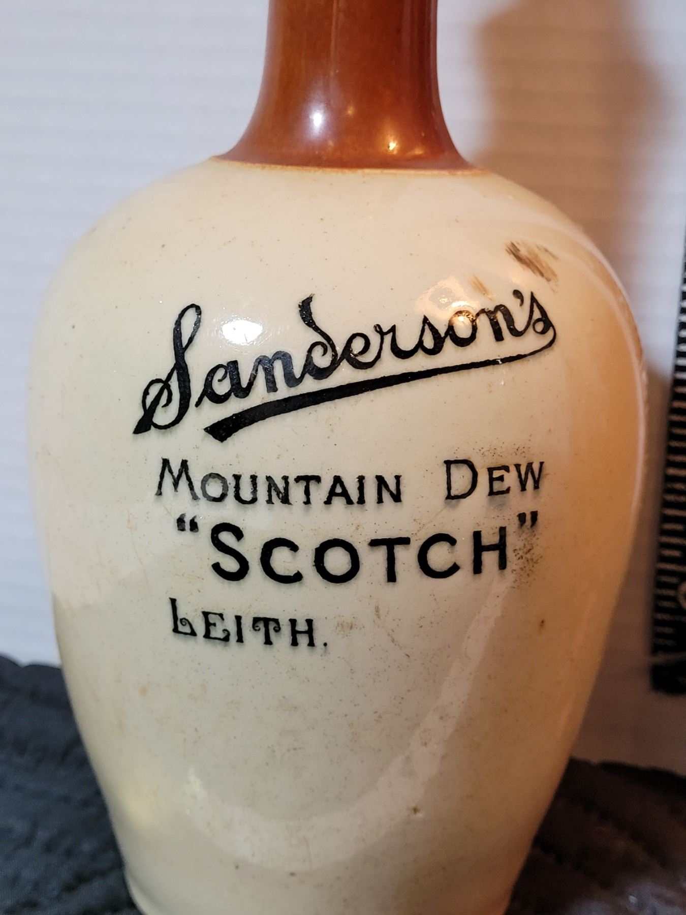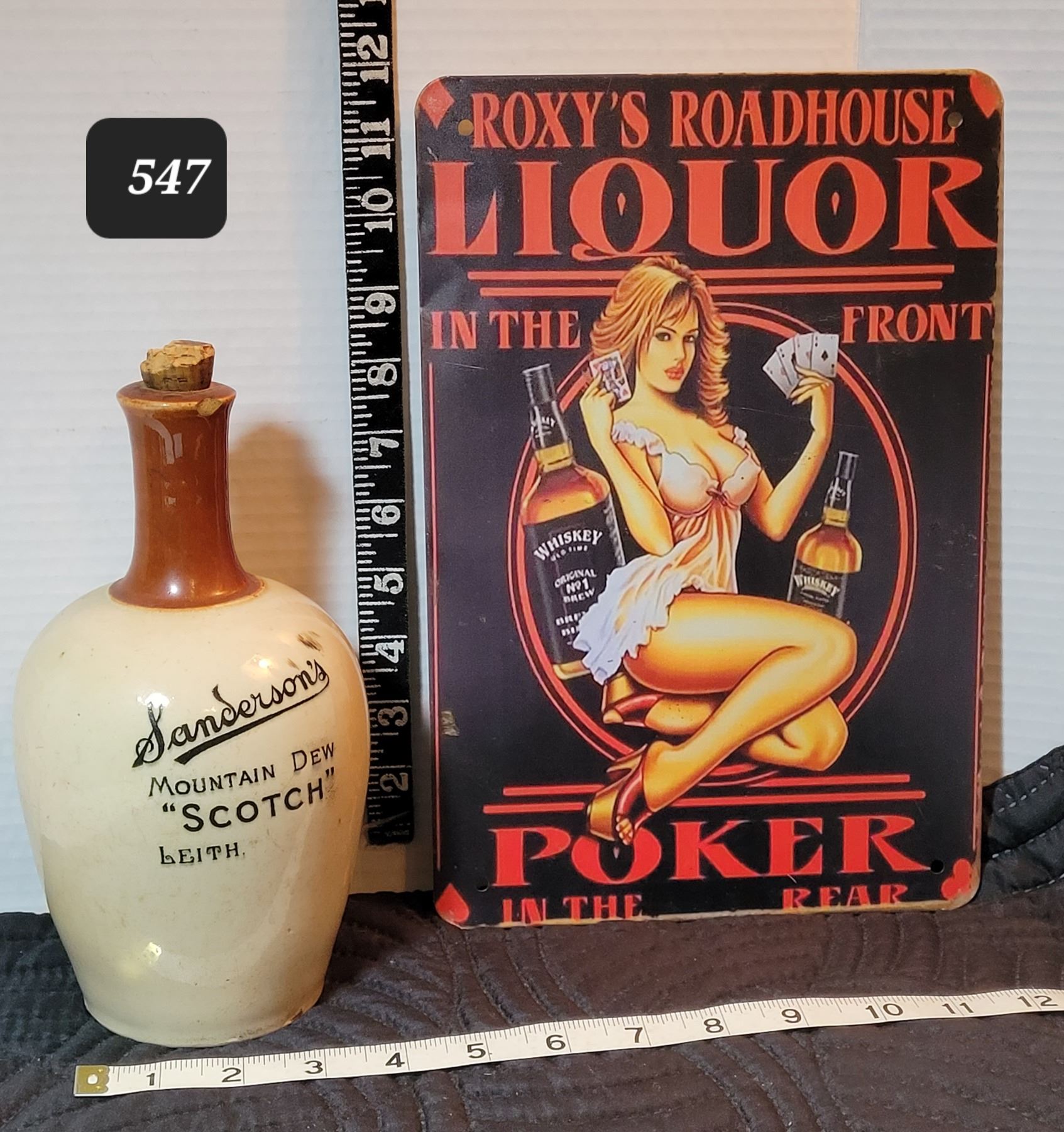 Roxy's Liquor sign & Sanderson's 'Mountain Dew' Scotch bottle. Broken handle.