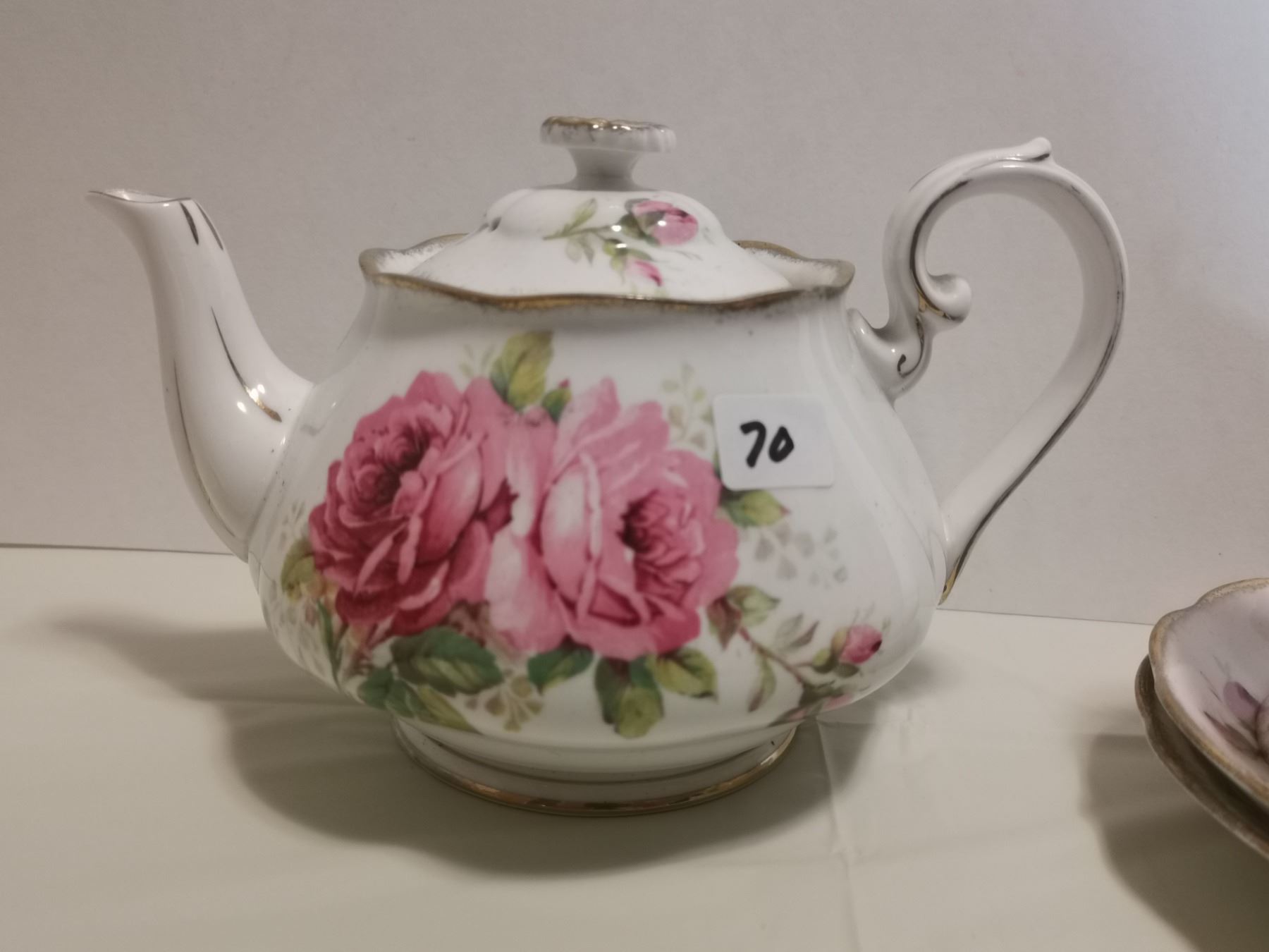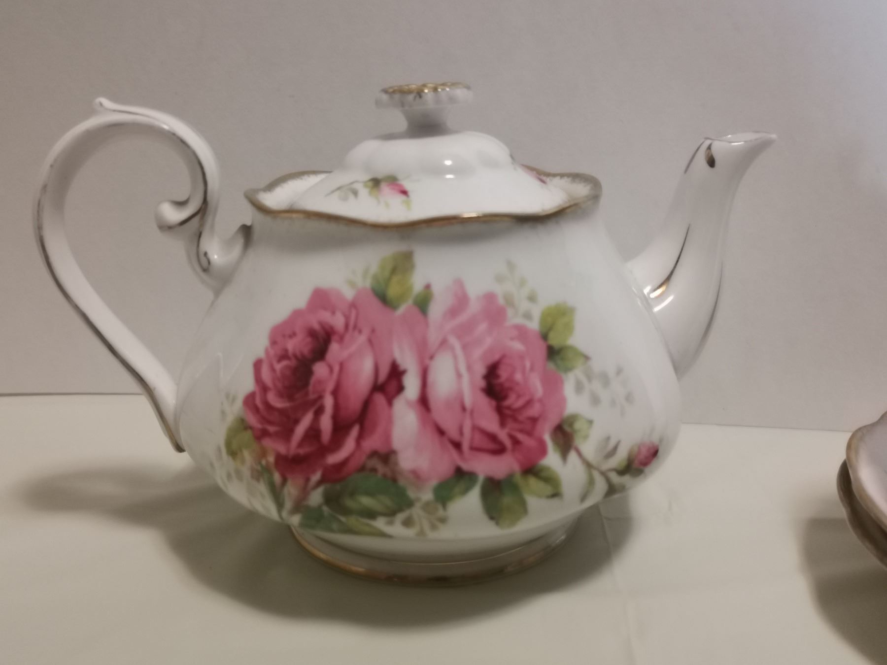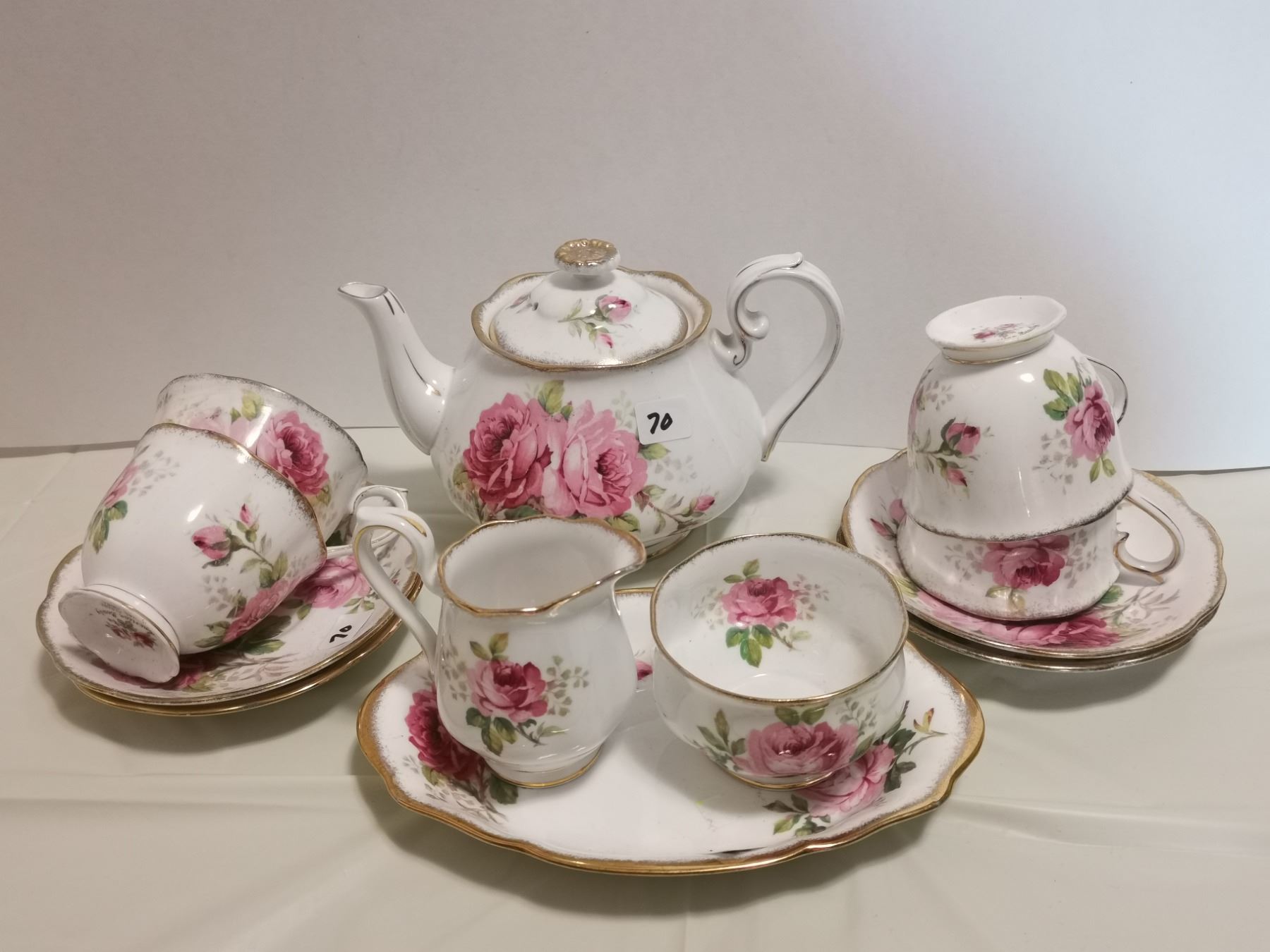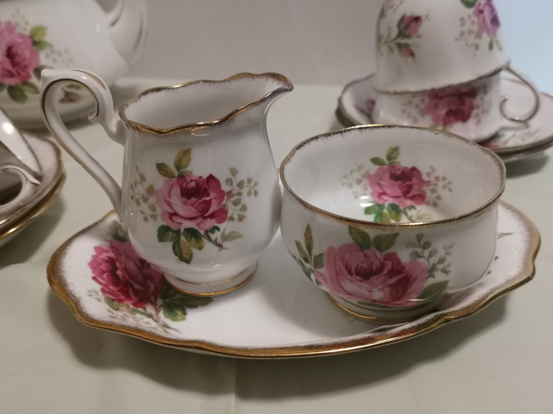 Royal Albert American Beauty teapot, 4 cups & saucers, cream & sugar bowl & plate