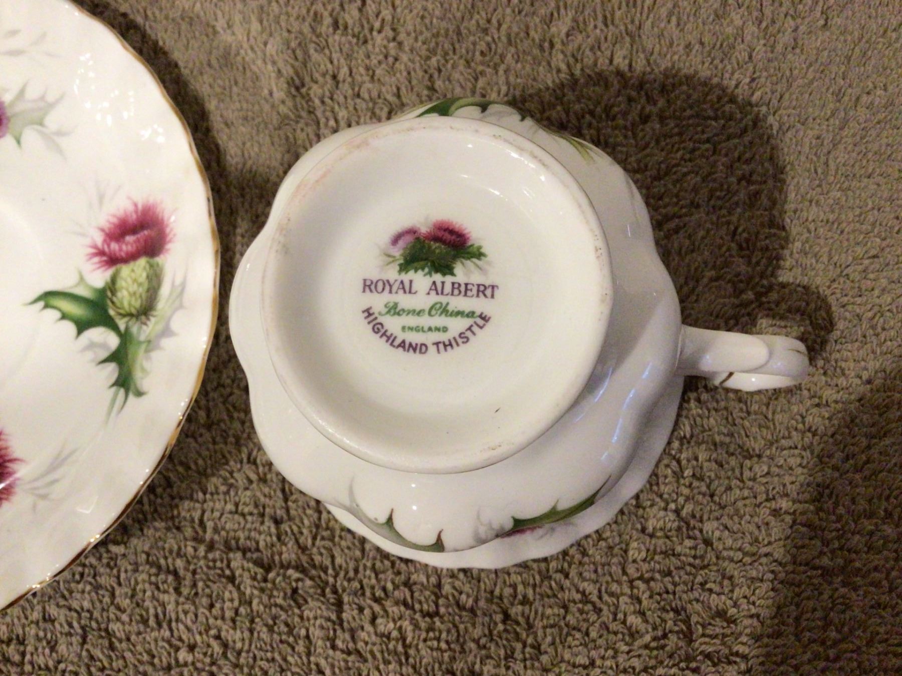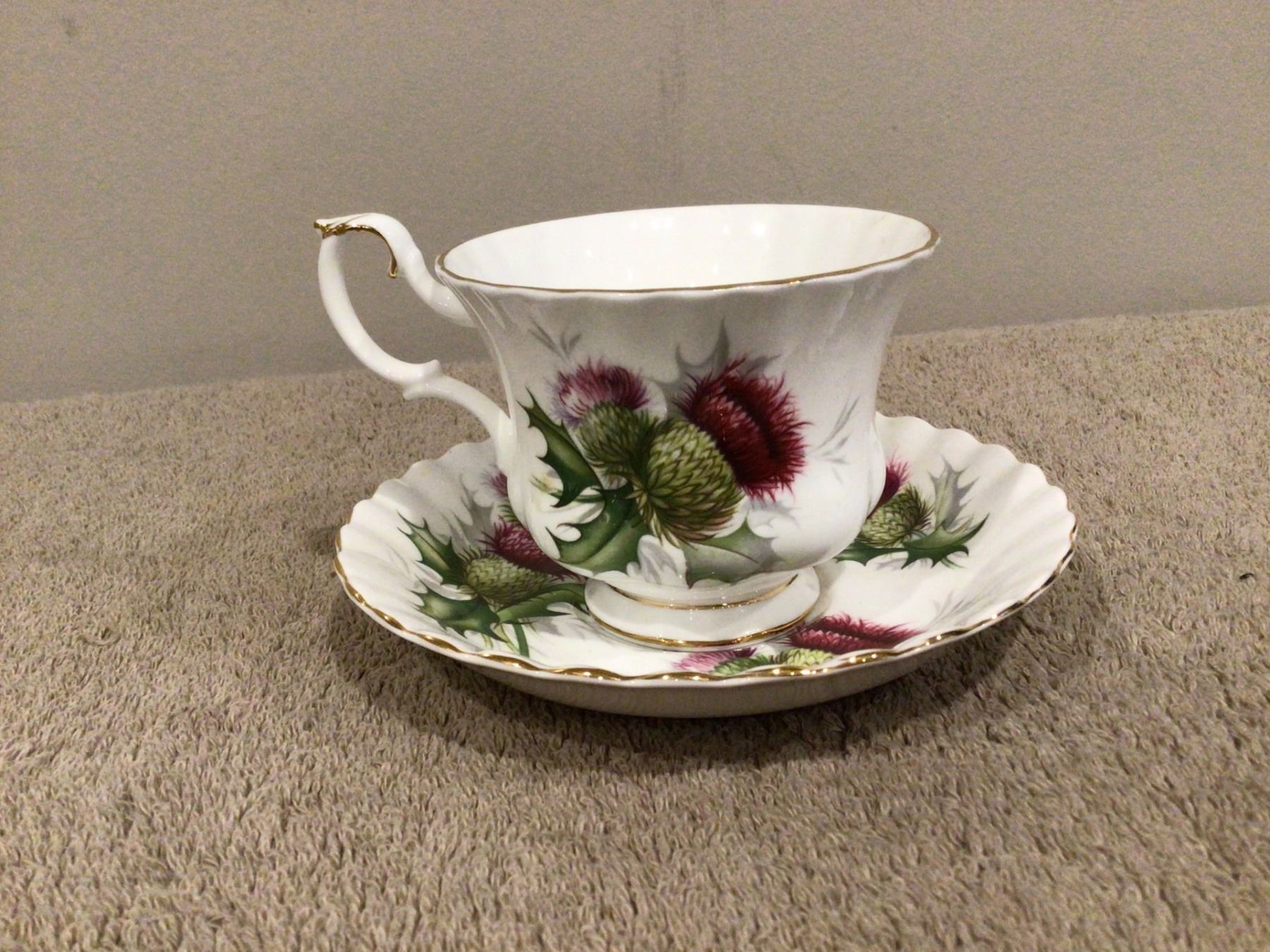 Royal Albert English china teacup and saucer. "Highland Thistle" Exc. condition.