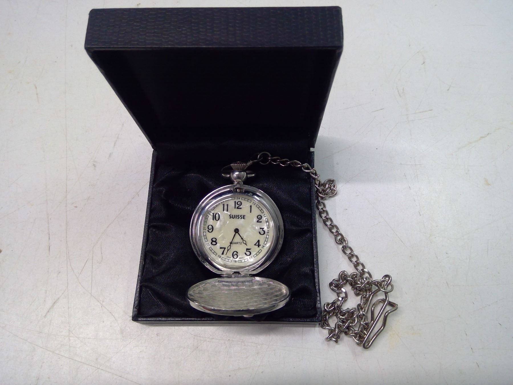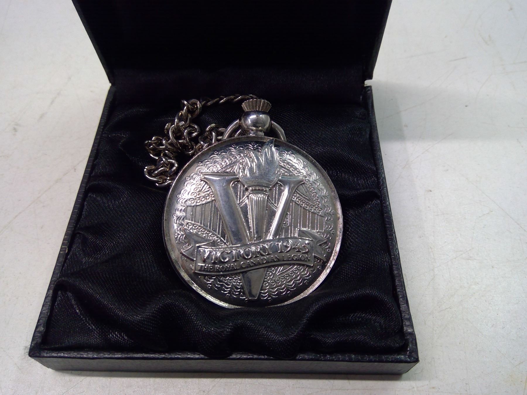Royal Canadian Legion Pocket Watch celebrating the 1945 Victory of World War II. Suisse Quartz with Japanese movement. Housed in its box of issue. Watch does not work. Probably needs a battery.