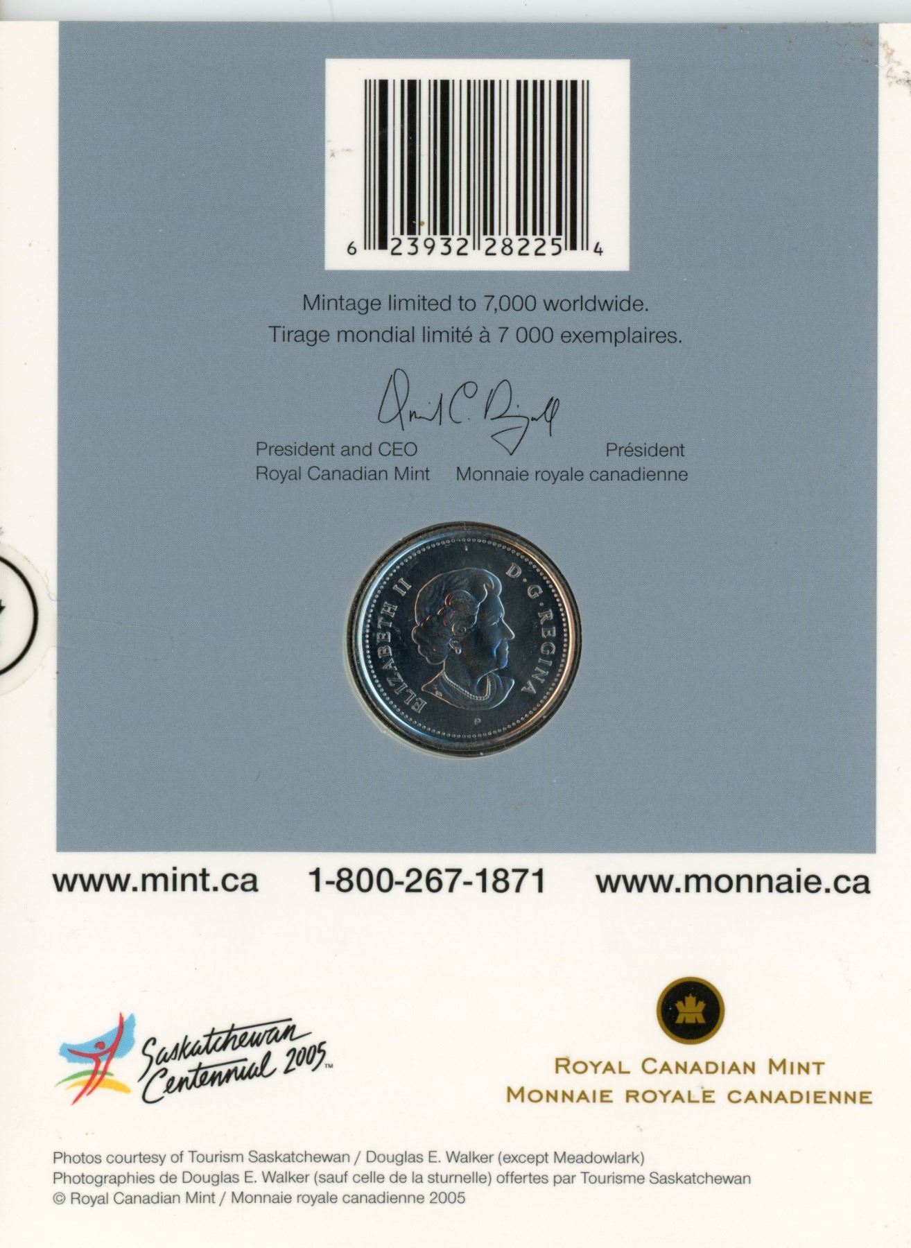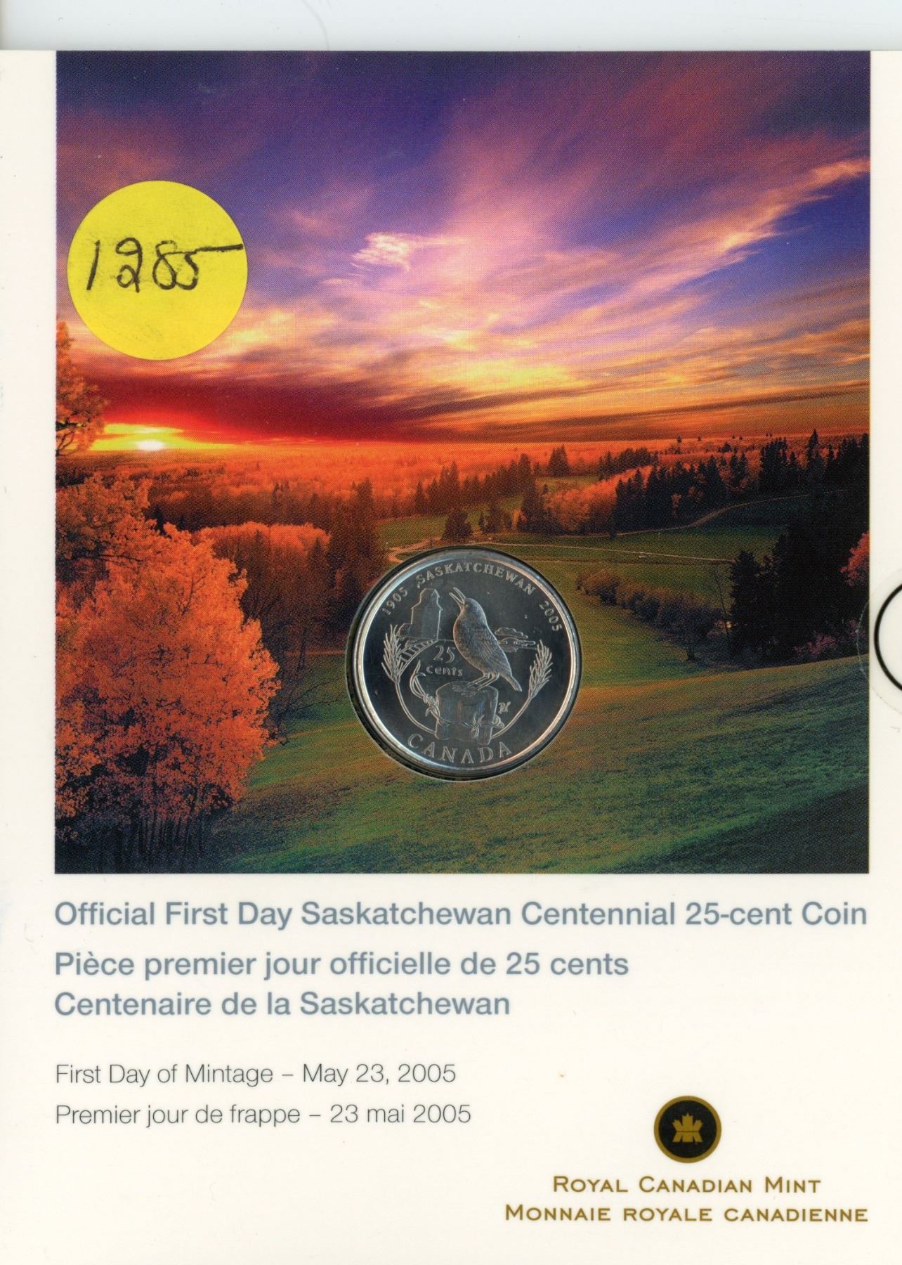 Royal canadian mint - official first day saskatchewan centennial 25-cent coin