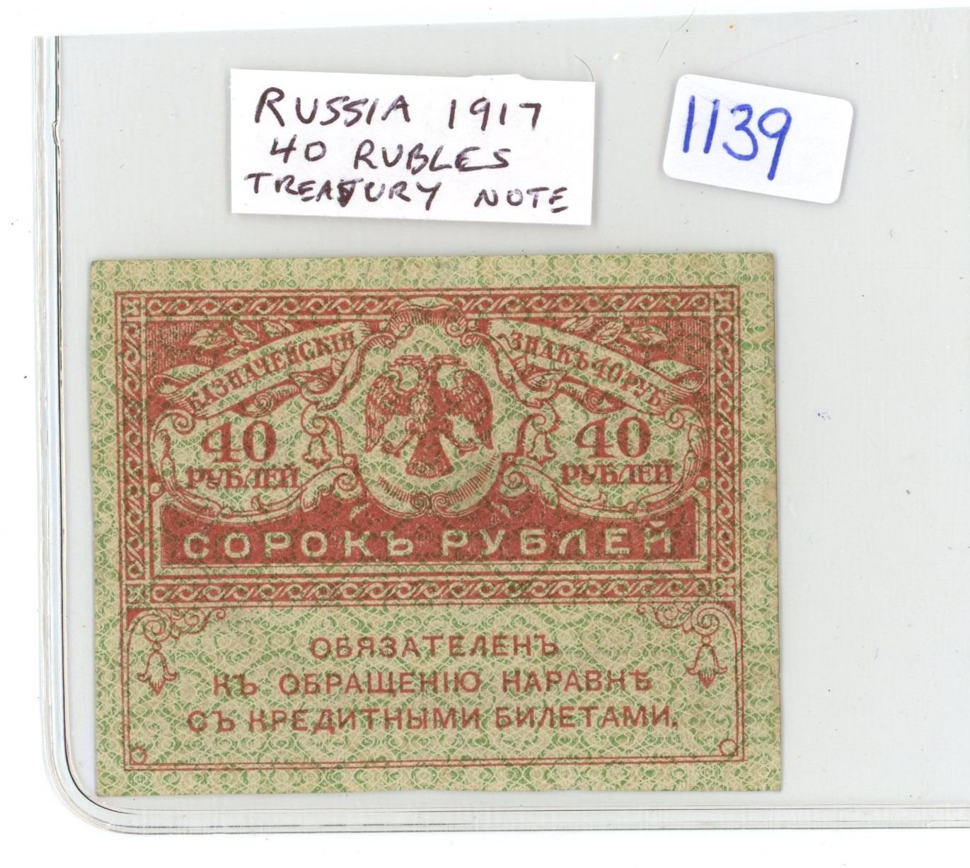 Russia. 1917 40 Rubles Treasury Note. Issued after the fall of the Czar but before the Bolshevik Revolution. These tiny notes are often called Kerensky Rubles for the short-lived Kerensky government . VF.