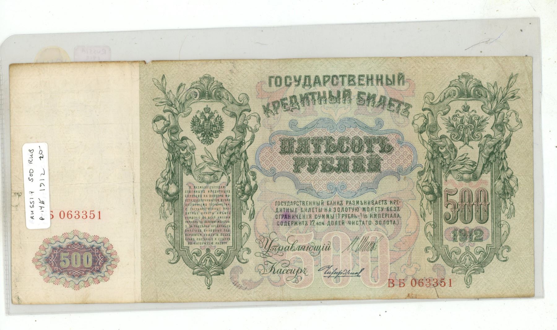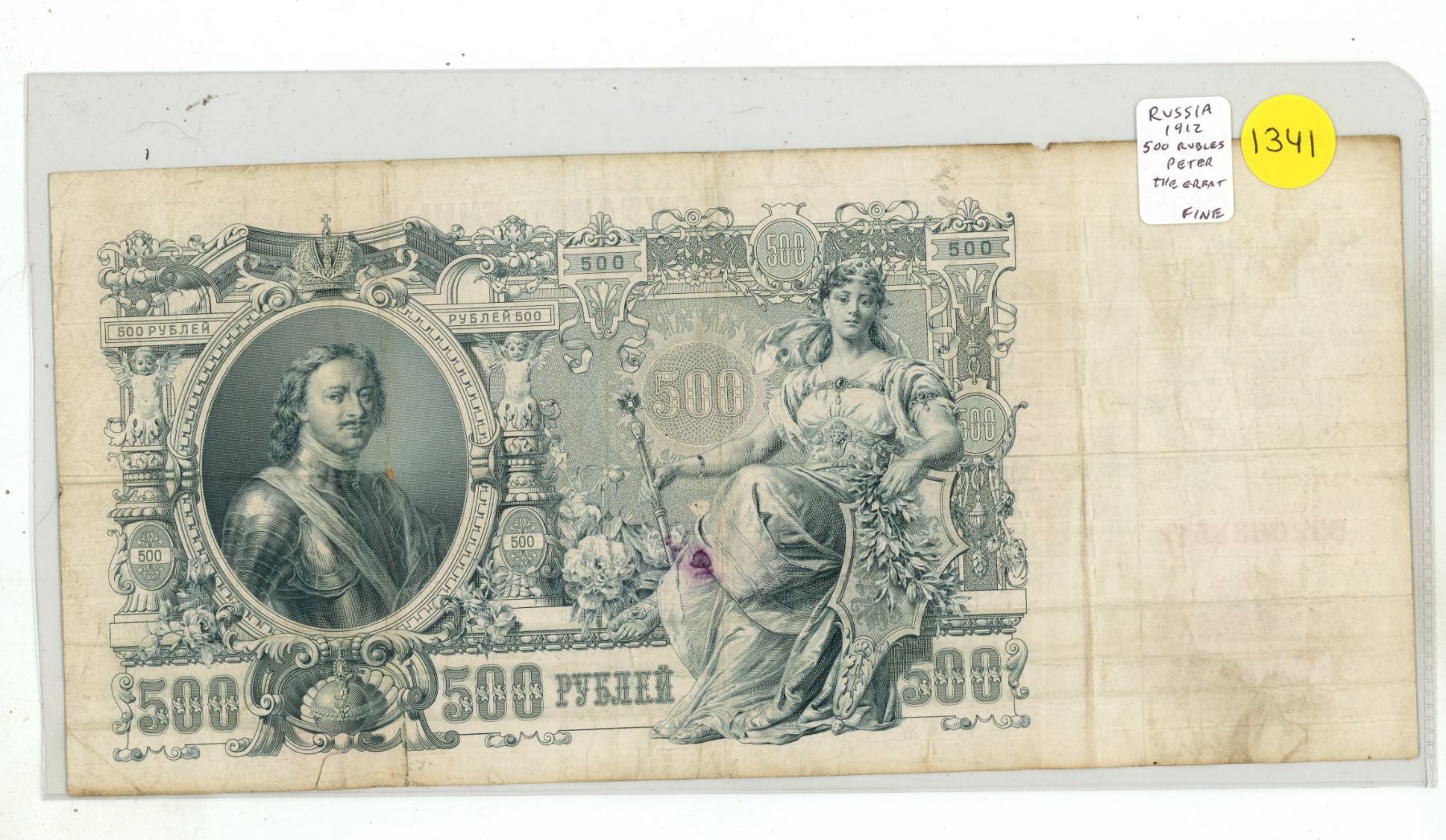 Russia – Empire. 1912 500 Rubles. Czar Peter the Great. Large note. Fine.