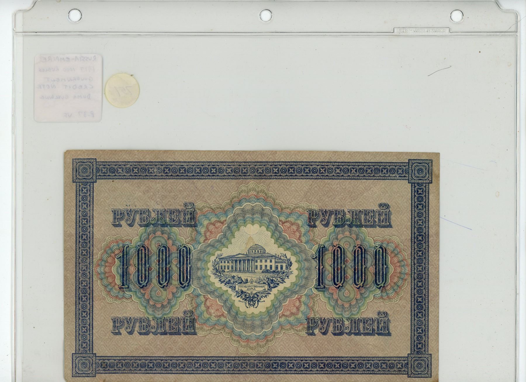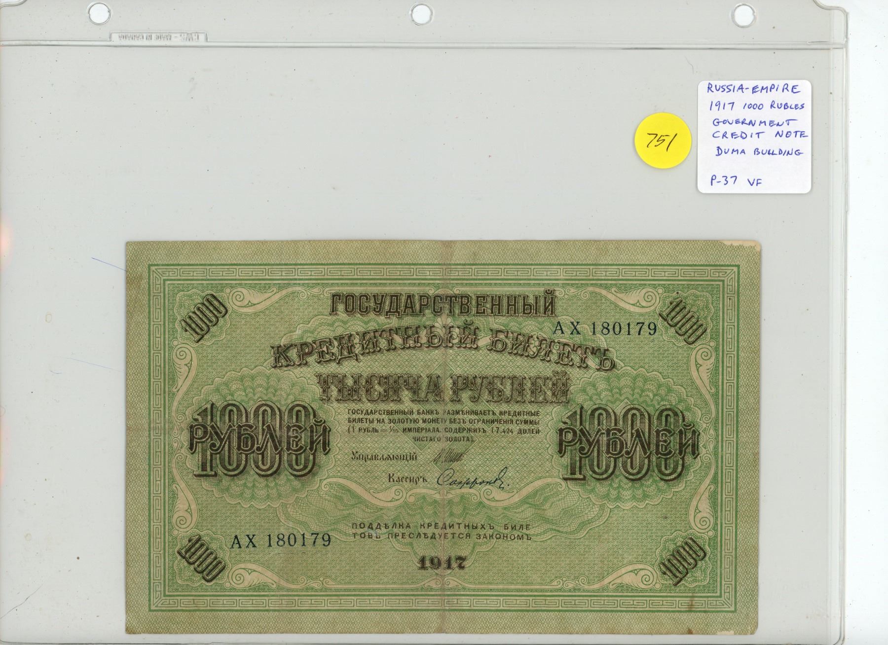 Russia – Empire. 1917 1000 Rubles Russian Government Credit Note. Issued just prior to the Russian Revolution. Large size banknote measures 8 ¼” X 5”. P-37. VF.
