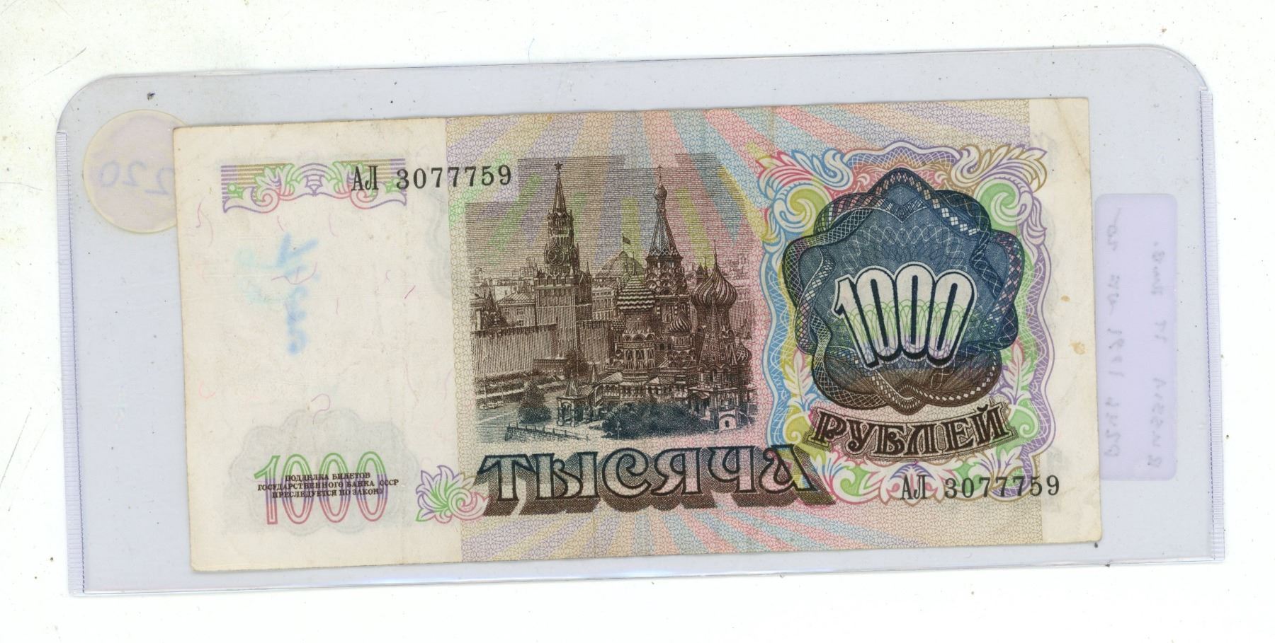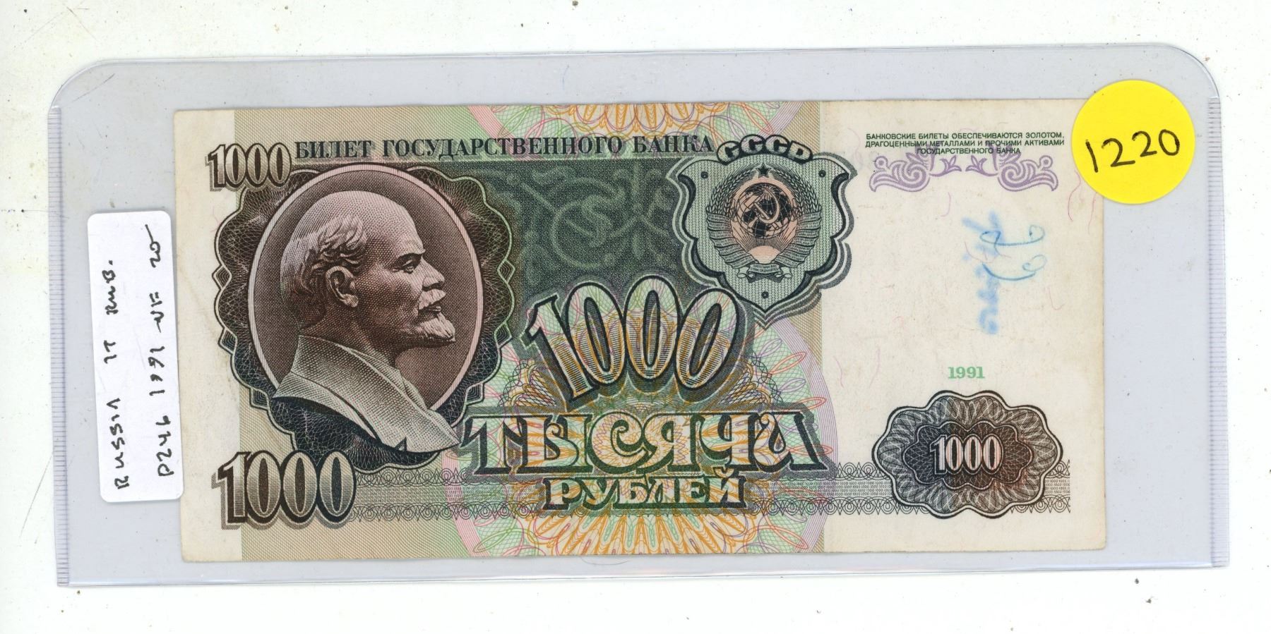 Russia – USSR. 1991 1000 Rubles. High denomination note. Lenin. VF.