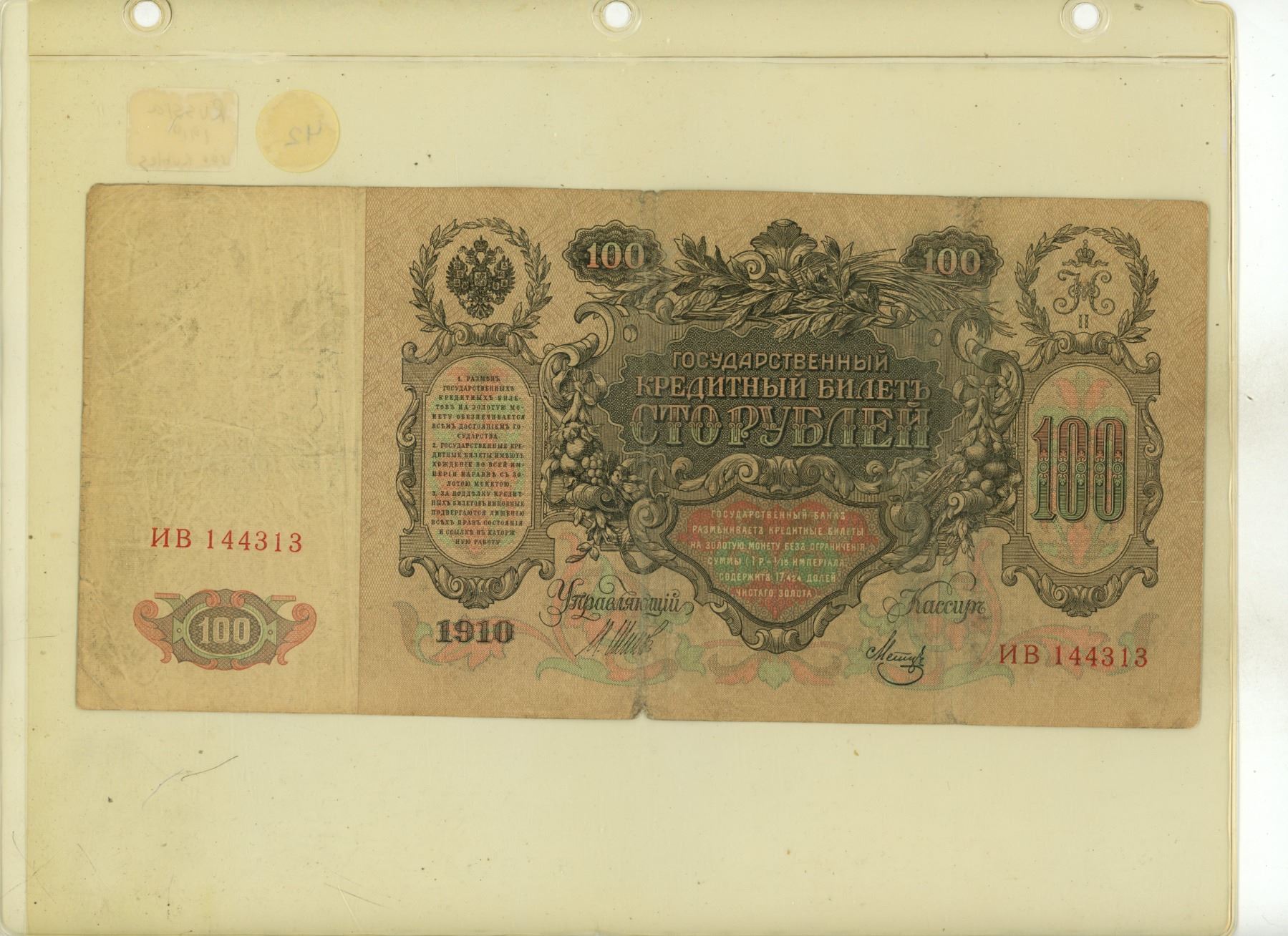 Russia under the Czars. 1910 100 Rubles. Depicts Empress Catherine the Great. Fine+.