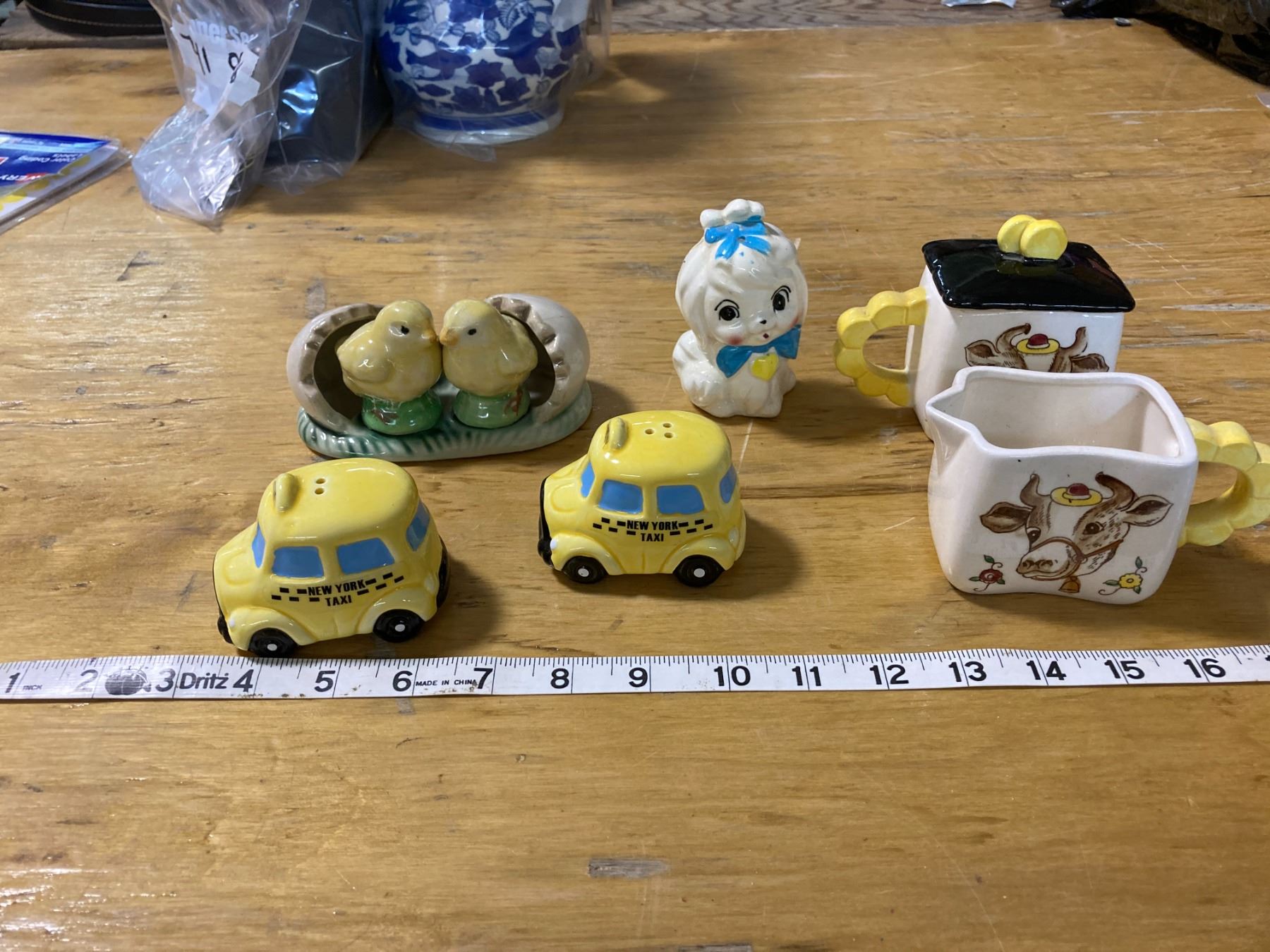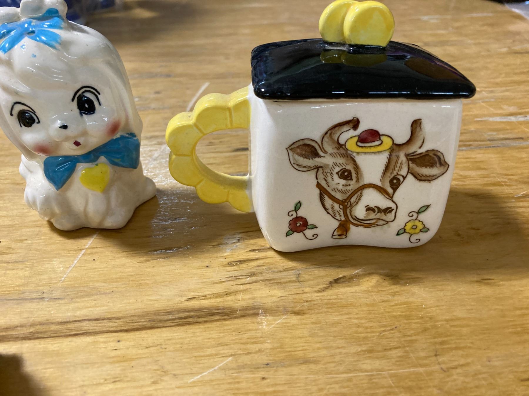 SALT AND PEPPER SHAKERS + COW CREAMER AND COW SUGAR DISH