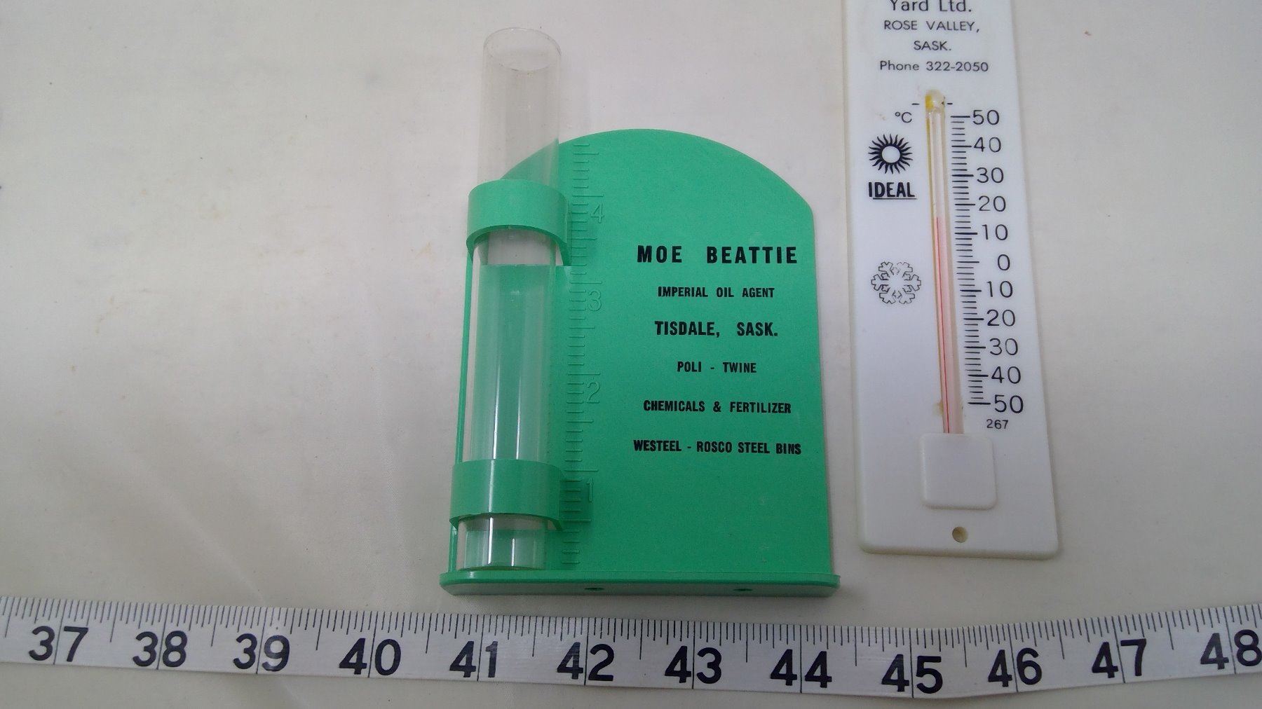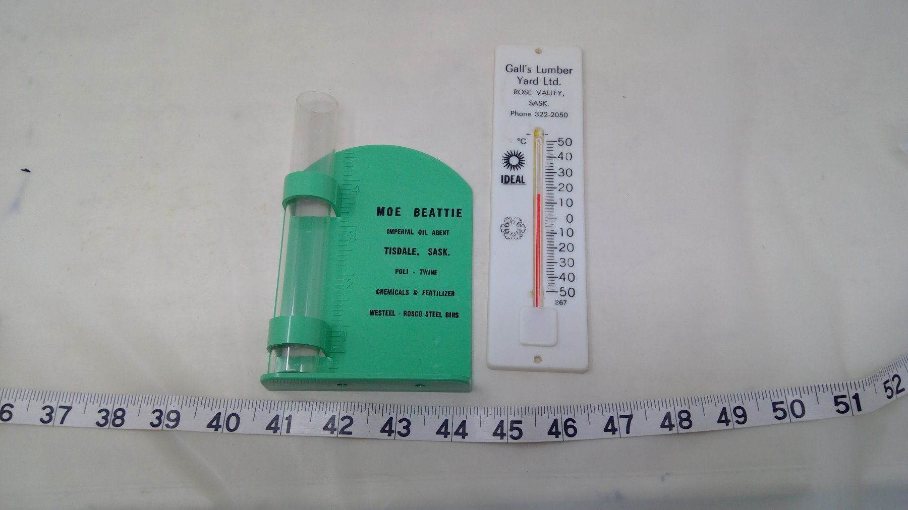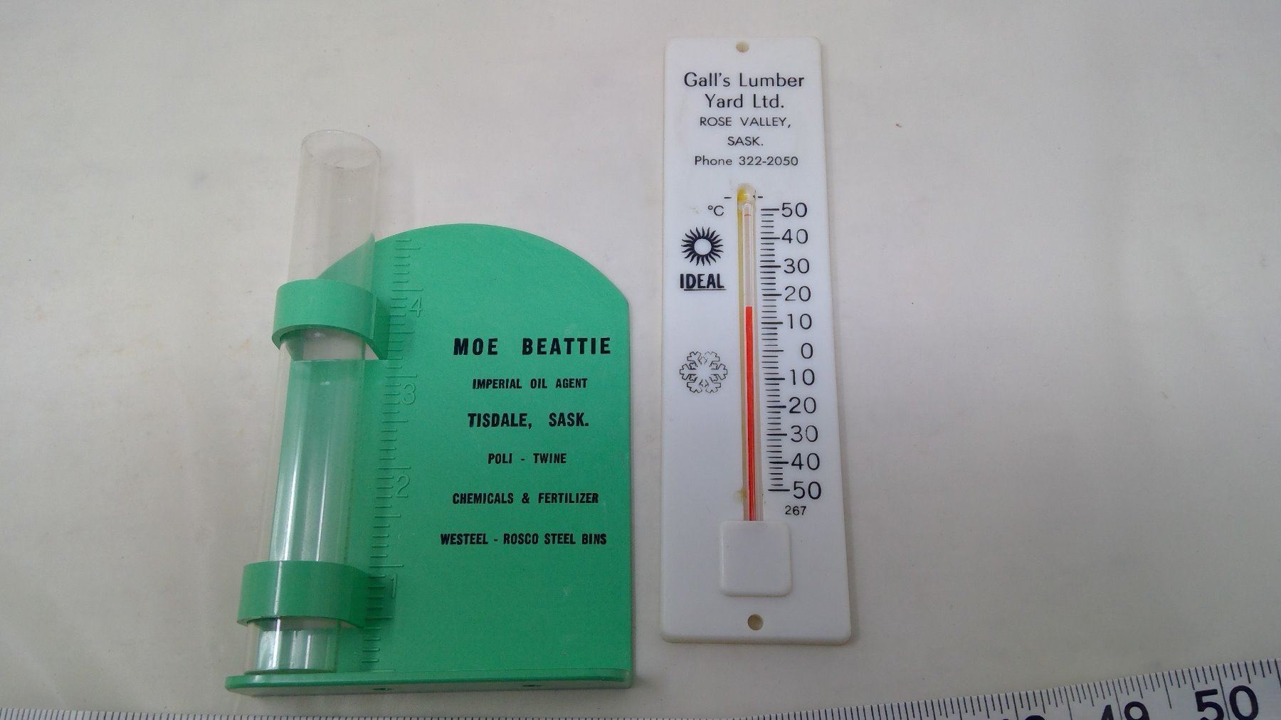 SASK ADVERTISING RAIN GAUGE & THERMOMETER