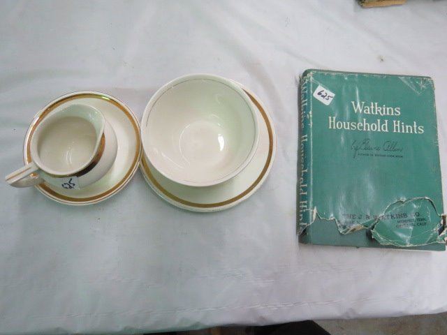 SAUCERED CREAM AND SUGAR & 1941 WATKINS HOUSEHOLD HINTS (W/PAPER JACKET)