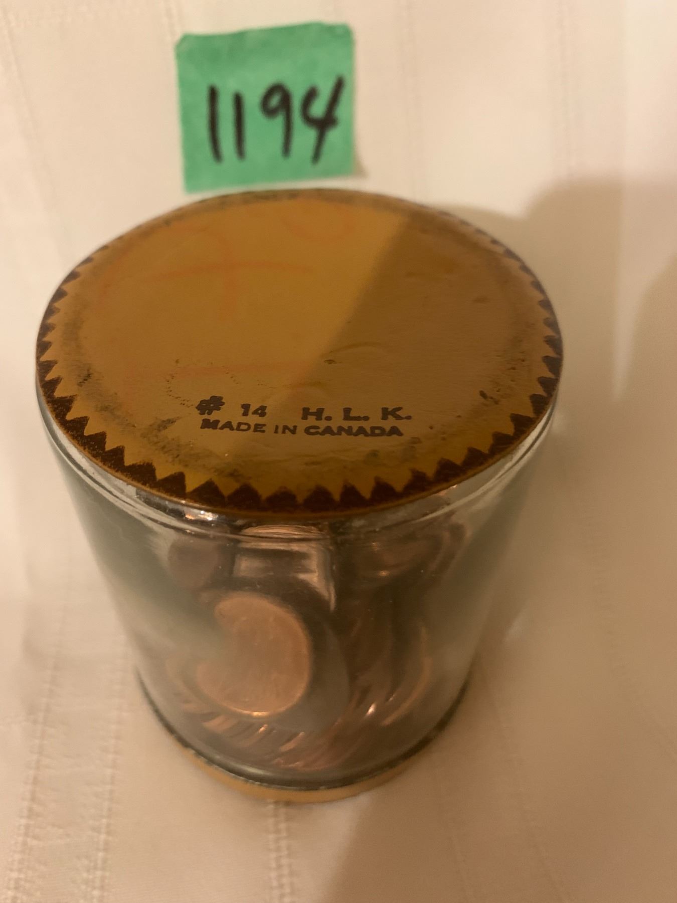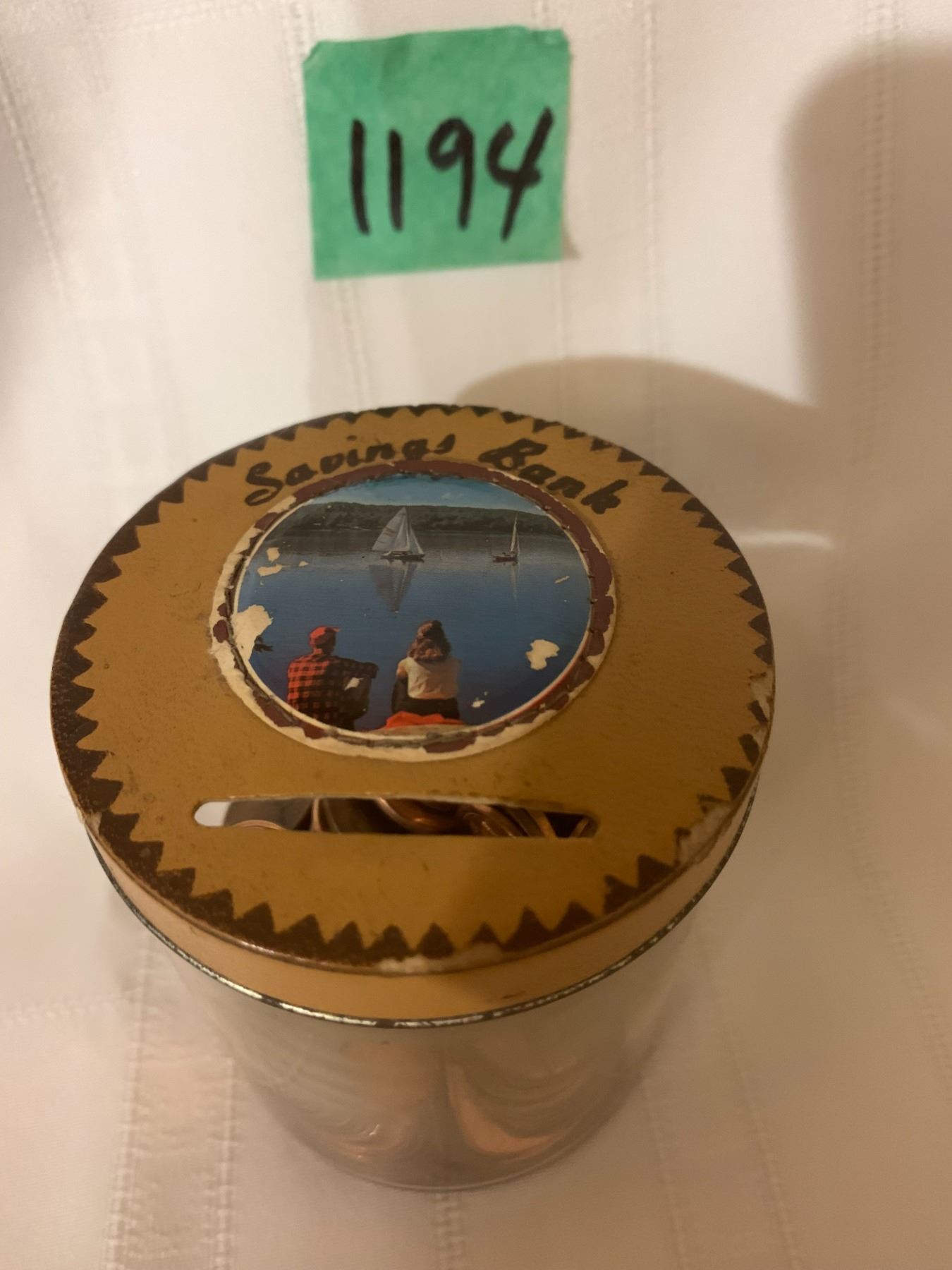 SAVINGS BANK WITH PENNIES. LEATHER TRIMMED HAND MADE IN CANADA