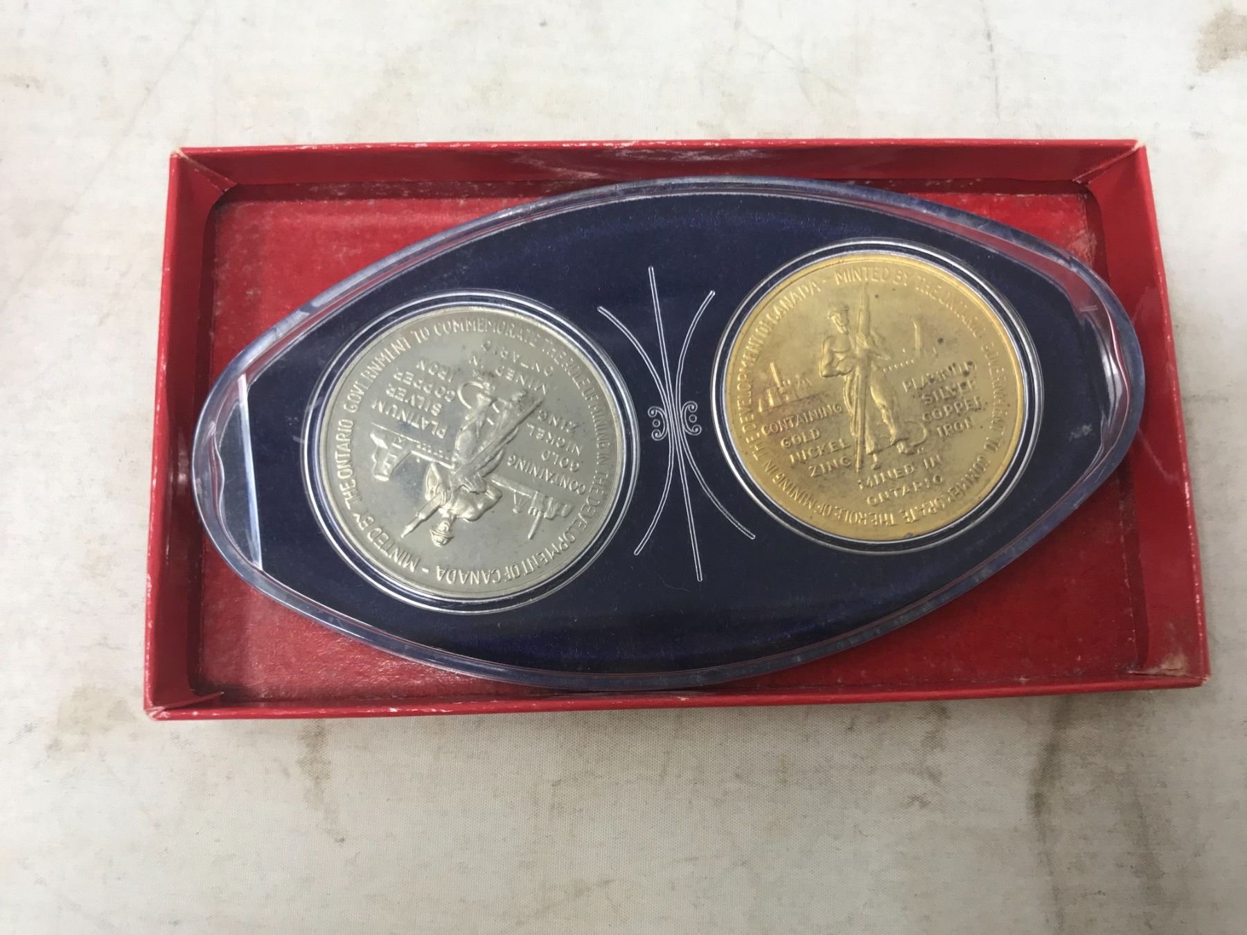 SET OF 2 ONTARIO COMMEMORATIVE MINING MEDALS, BOTH CONTAINING PLATINUM, GOLD, SILVER, NICKEL, COPPER, ZINC & IRON. ALL HOUSED IN A HARD PLASTIC HOLDER AND BOX OF ISSUE.