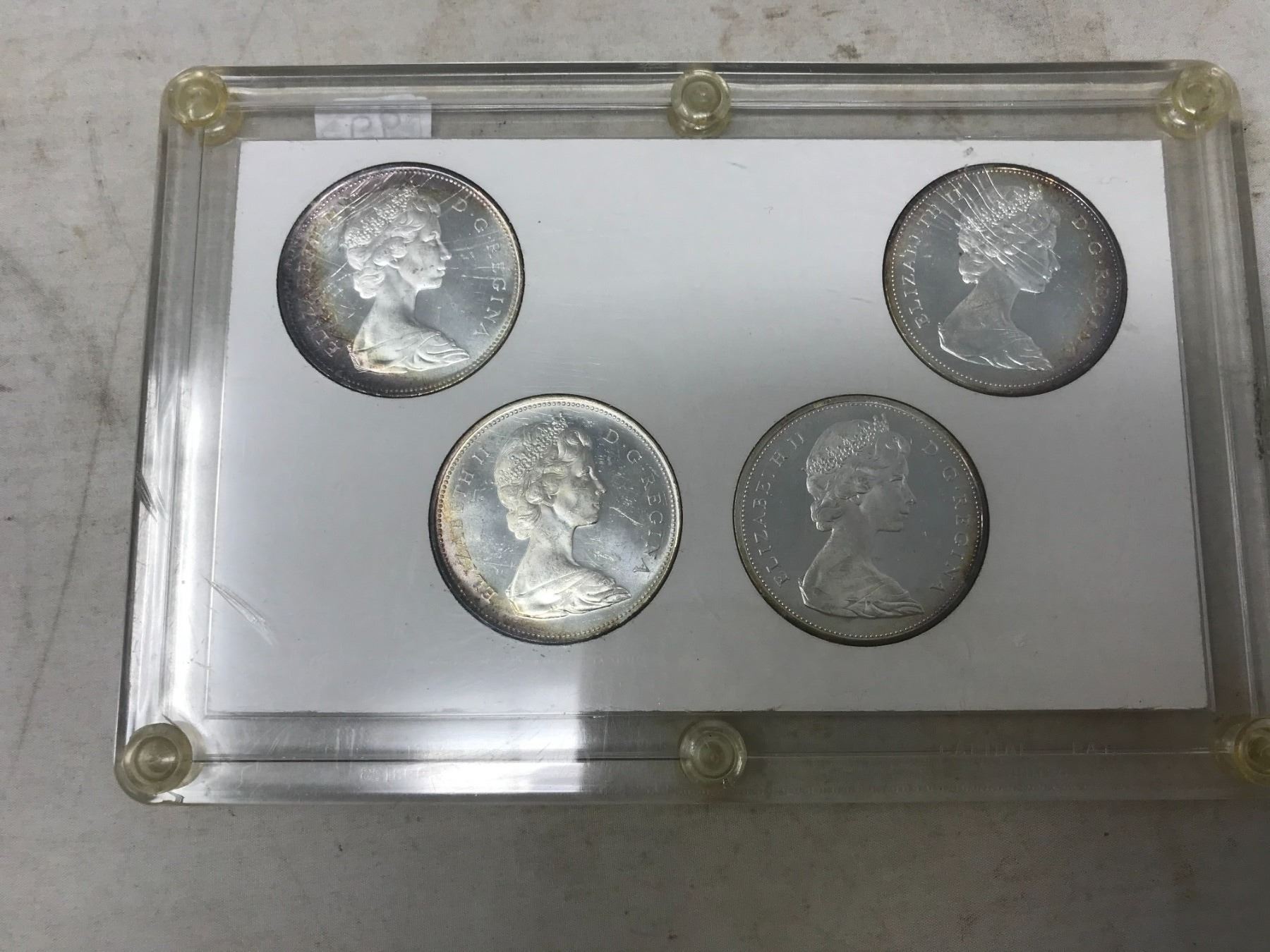 SET OF 4 1965 CANADIAN SILVER DOLLARS. INCLUDES TYPES 1, 2, 3 & 4. ALL COINS UNC. HOUSED IN CUSTOM HARD PLASTIC HOLDER.