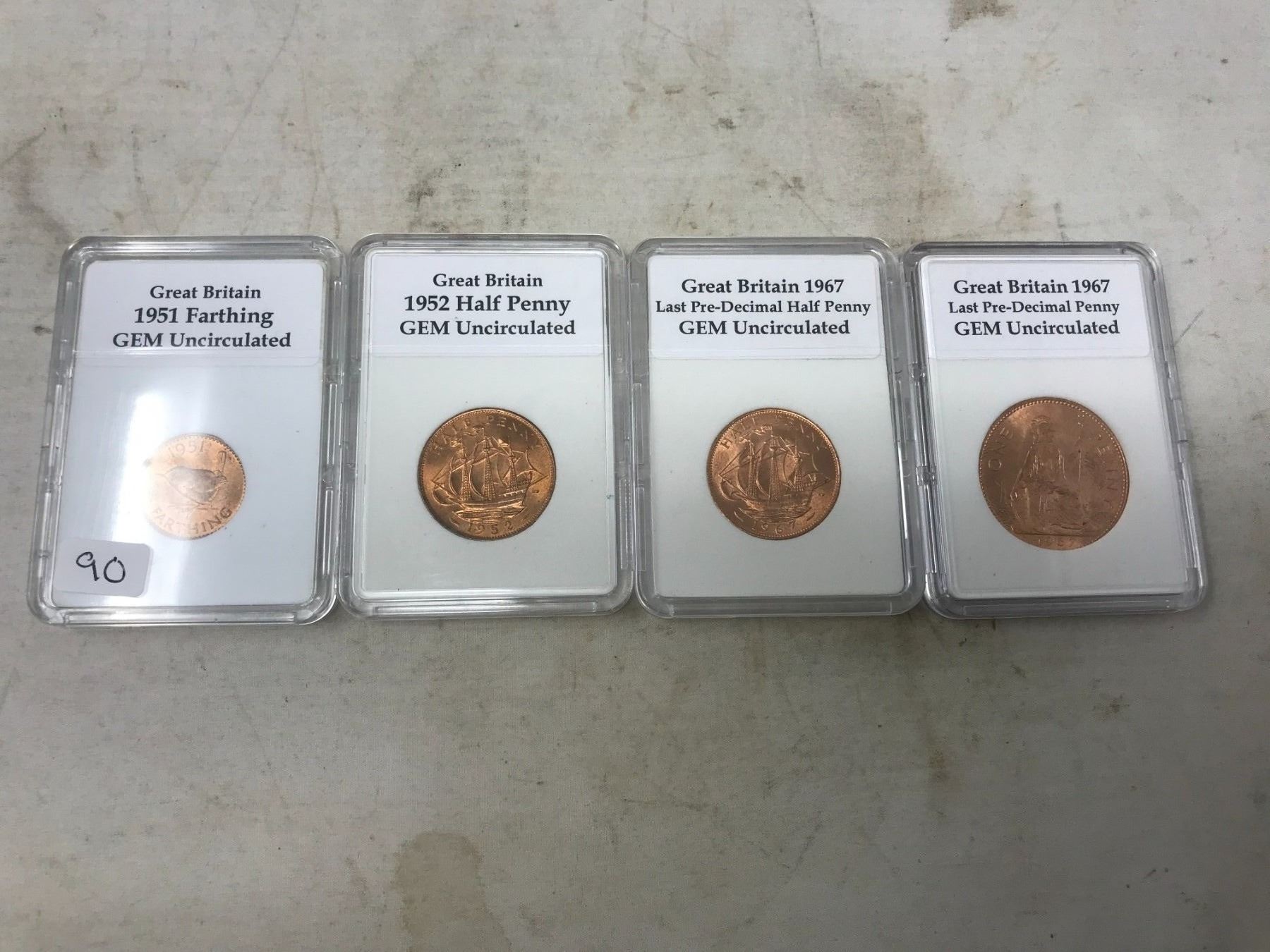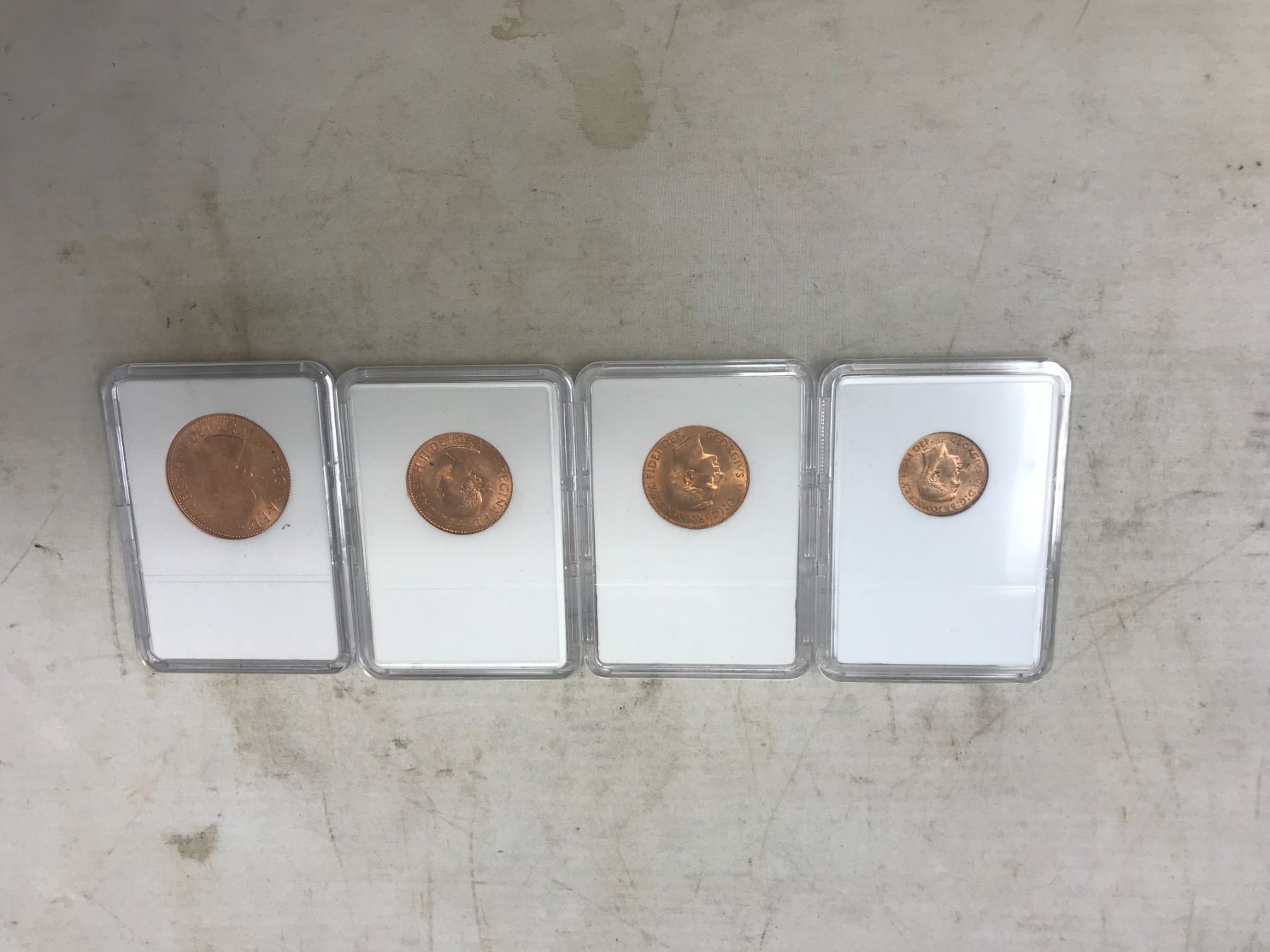 SET OF 4 BRITISH PRE-DECIMAL COINS IN GEM UNCIRCULATED CONDITION. INCLUDES 1951 FARTHING, 1952 HALF PENNY, 1967 HALF PENNY & 1967 PENNY. ALL HOUSED IN HARD PLASTIC HOLDERS. NICE.