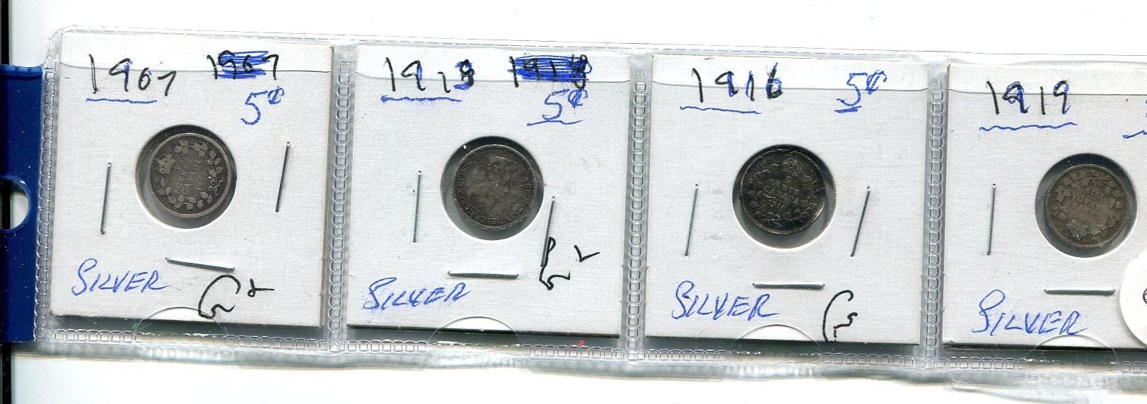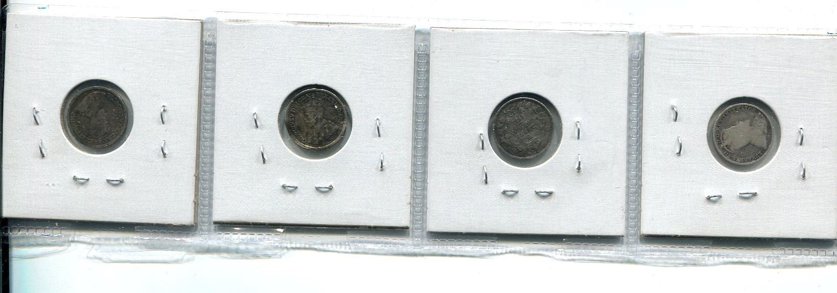 SET OF 4 SILVER CDN 5 CENT COINS 1907/1913-16/1919