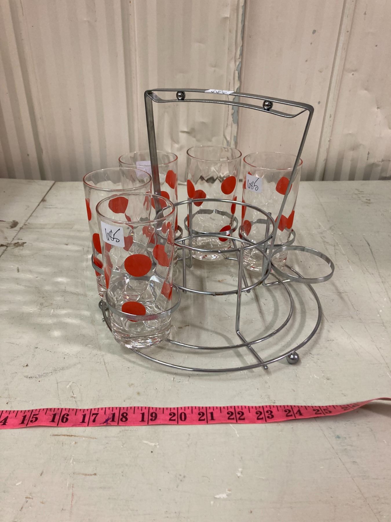 SET OF 5 RETRO 1950'S POKKA DOT DRINK GLASSES WITH HOLDER
