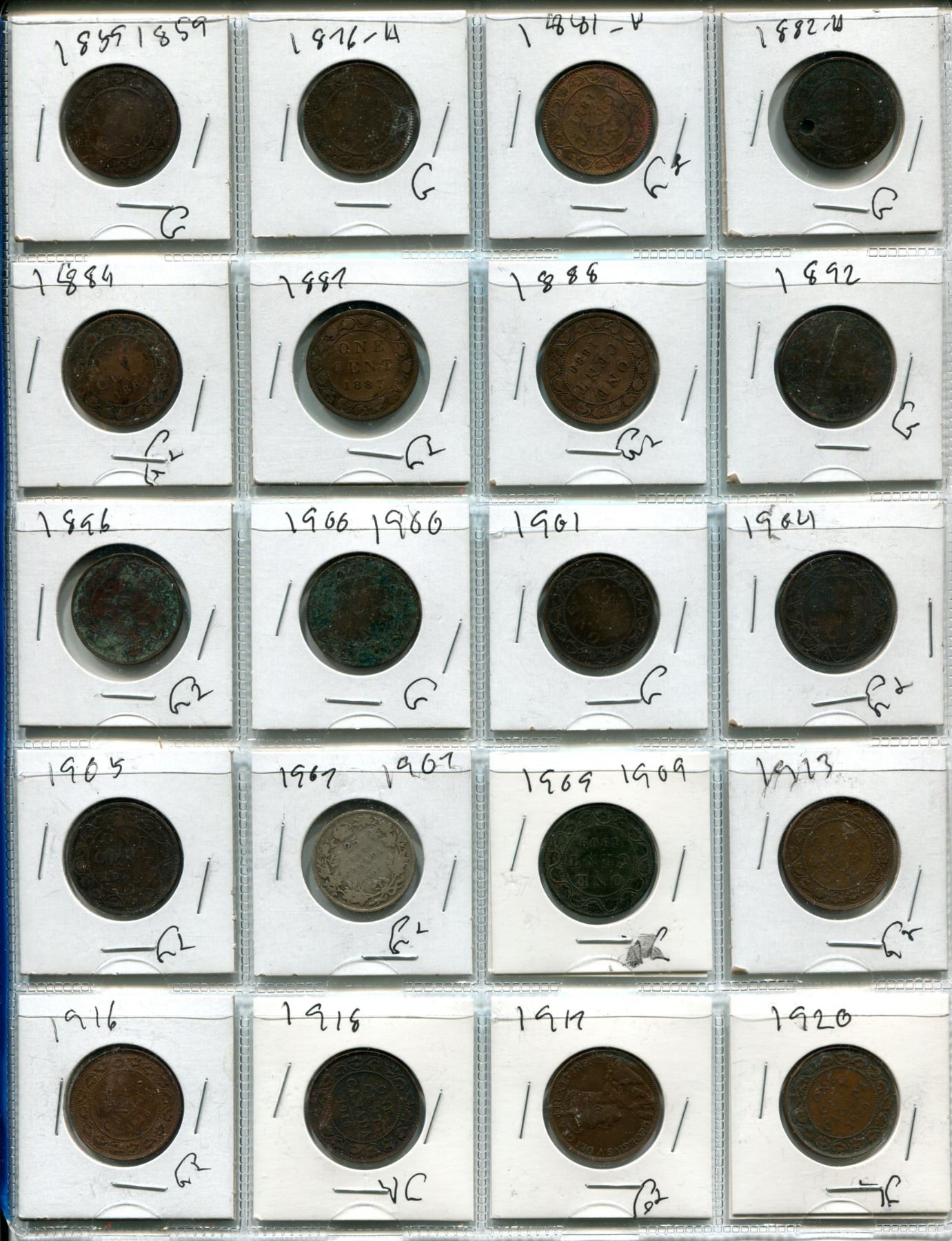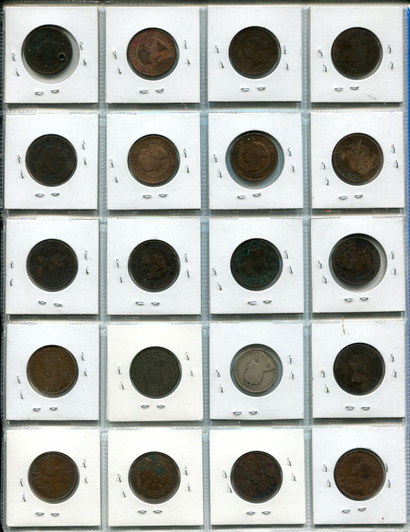 Sheet of 20 Canadian One Cent Coins - 1885-1920