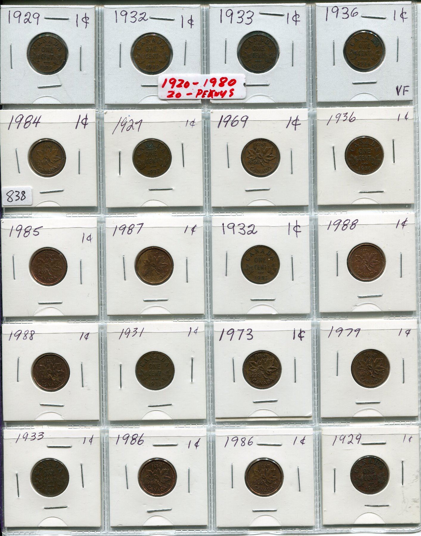 SHEET OF 20 CNDN 1 CENT PCS (1920s-1980s)