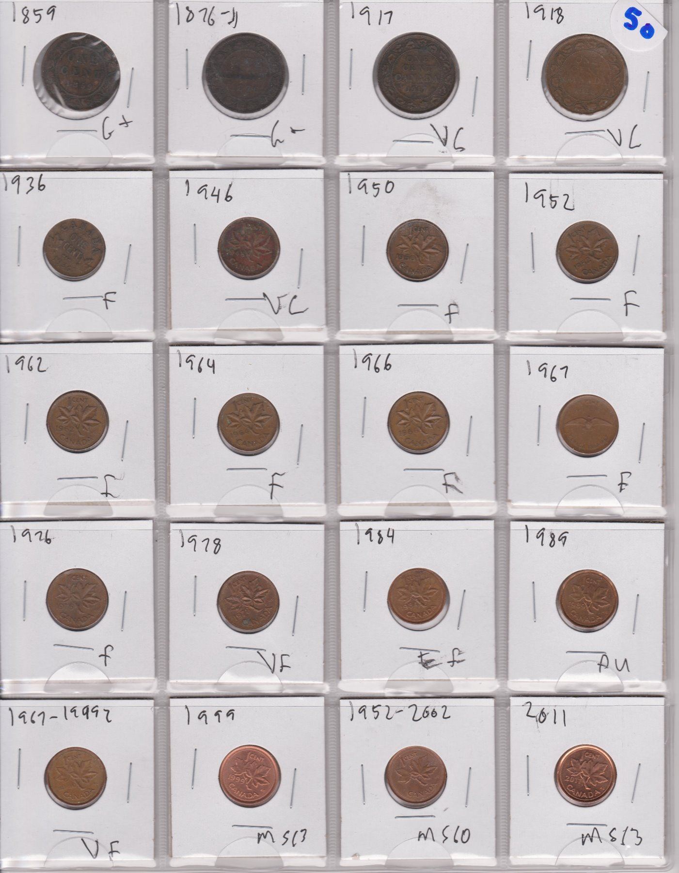 SHEET OF PENNIES 4 LRG 18959, 1876, 1917, 1918, 20 SMALL FROM 1936 - 2011
