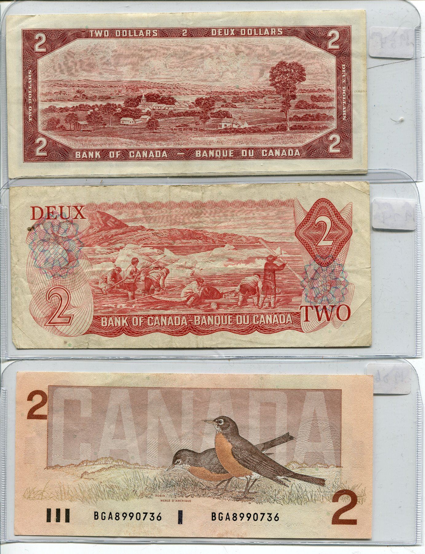 SHEET OF THREE CNDN $2 BANKNOTES *1954, 1974, 1986*