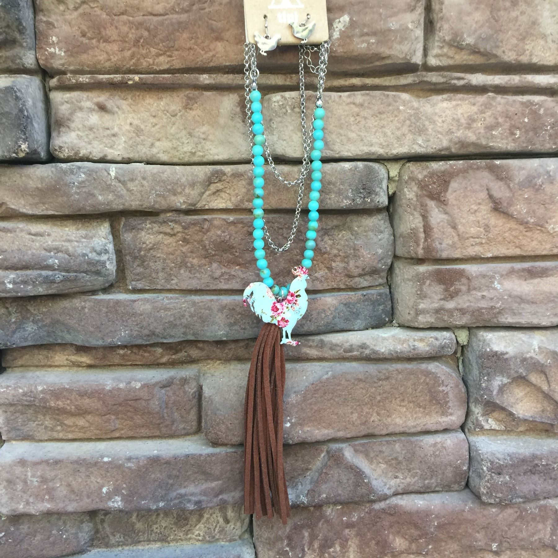 SILVER/BLUE FLORAL ROOSTER LONG NECKLACE WITH TURQUOISE BEADS AND BROWN FRINGE/HEN EARRINGS