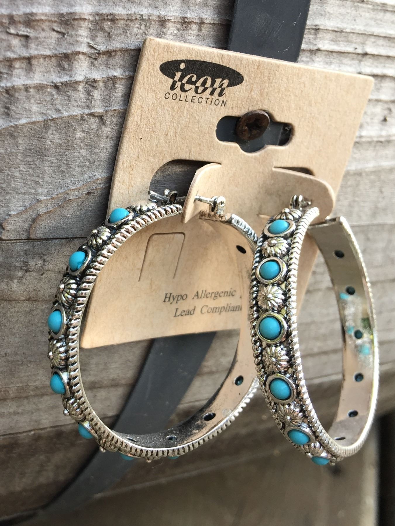 SILVER HOOPS 1 1/2" /TURQUOISE BEAD ACCENTS