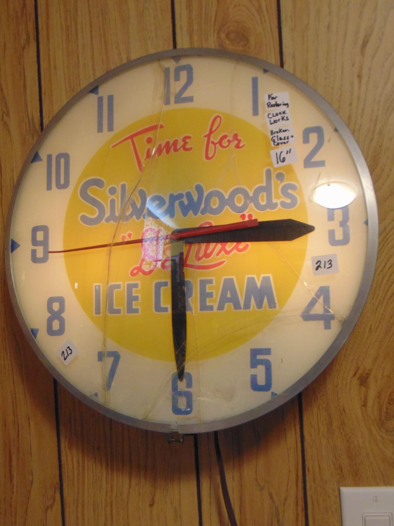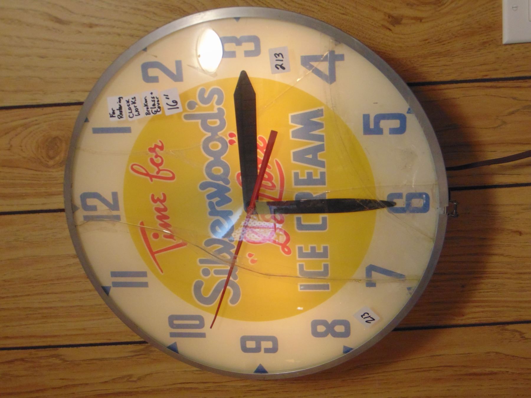 SILVERWOODS DELUXE ICE CREAM CLOCK 1960 GLASS REPAIRED (FOR RESTORATION)