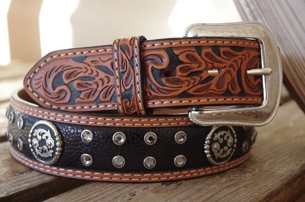 SIZE 44"HAND TOOLED BLACK LEATHER BELT SILVER ENGRAVED ROUND CONCHOS/Clear crystal design in between round engraved conchos/Removable western buckle/Belt width 1.5"