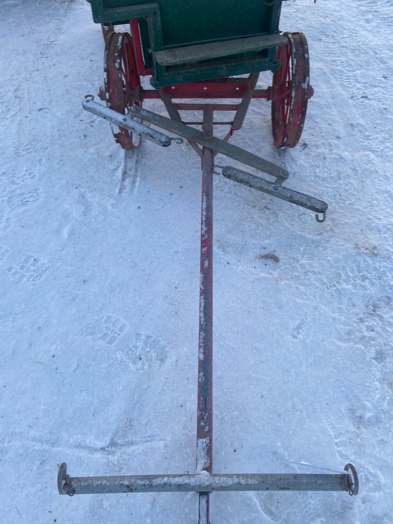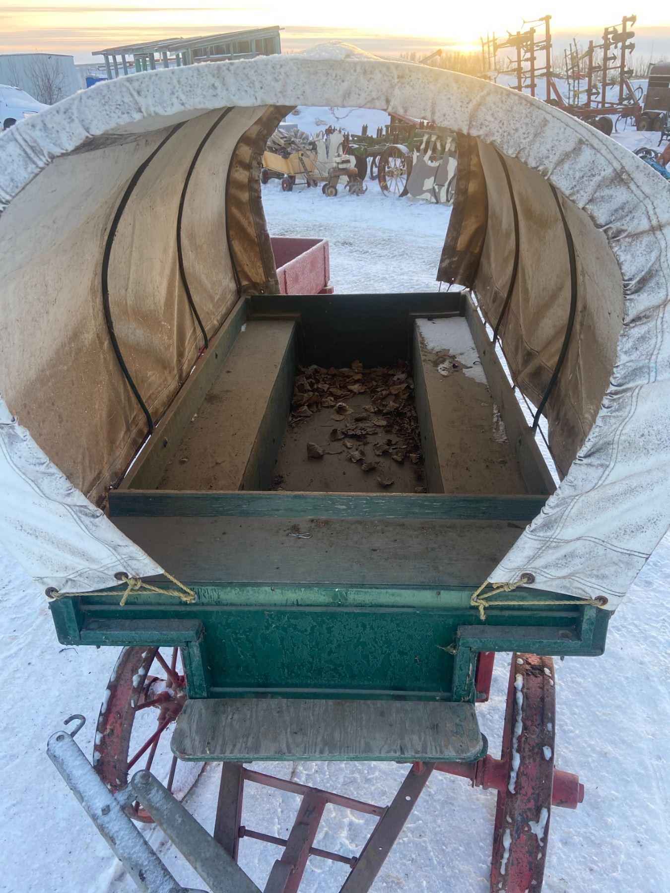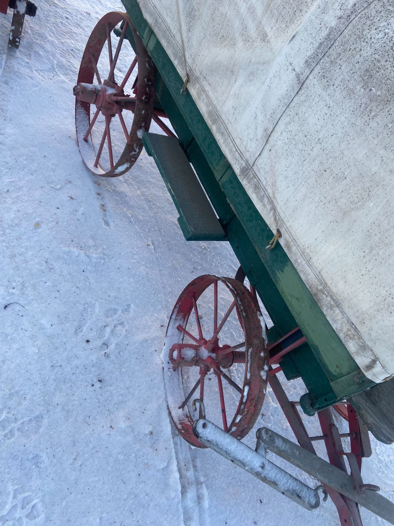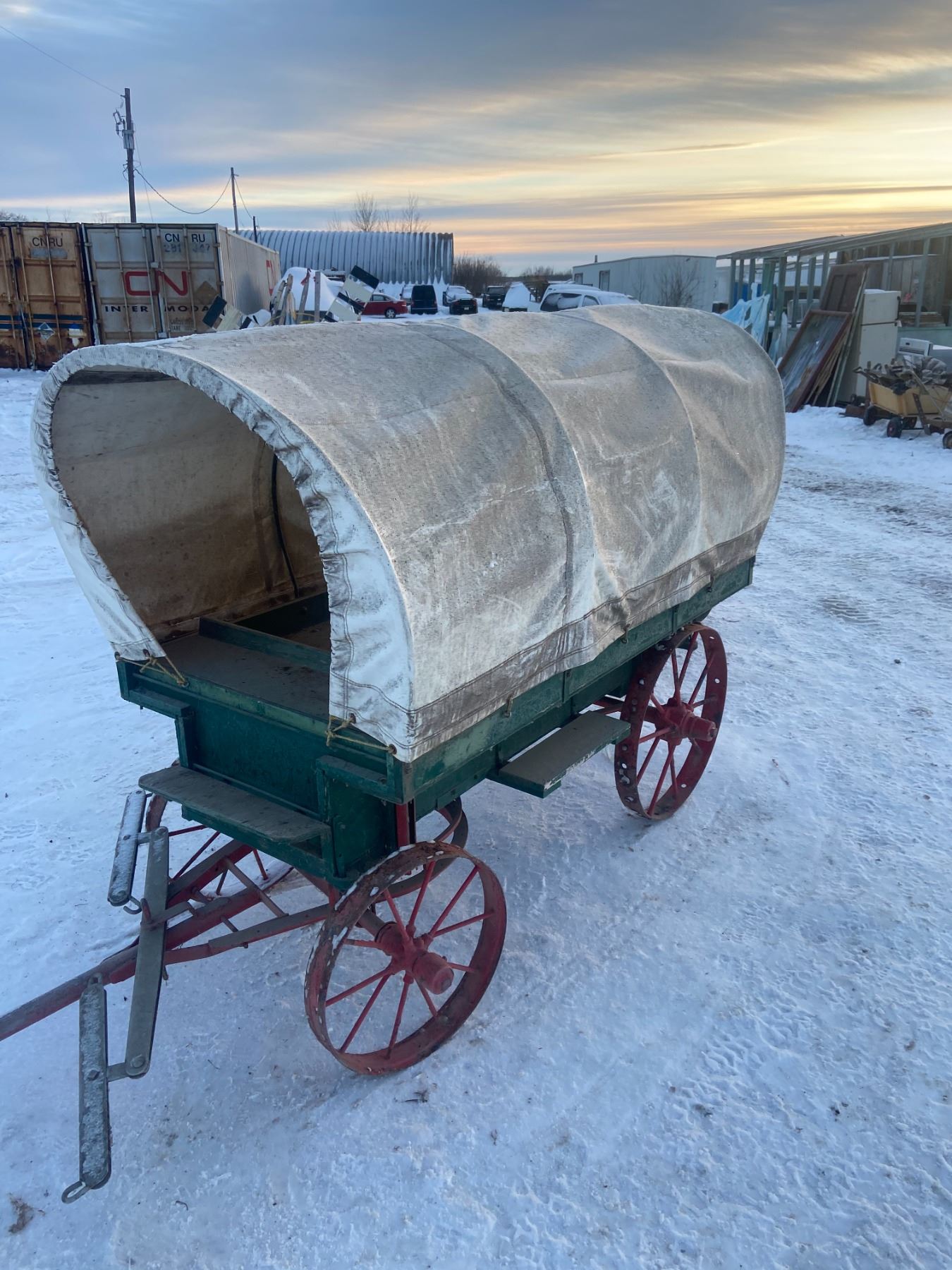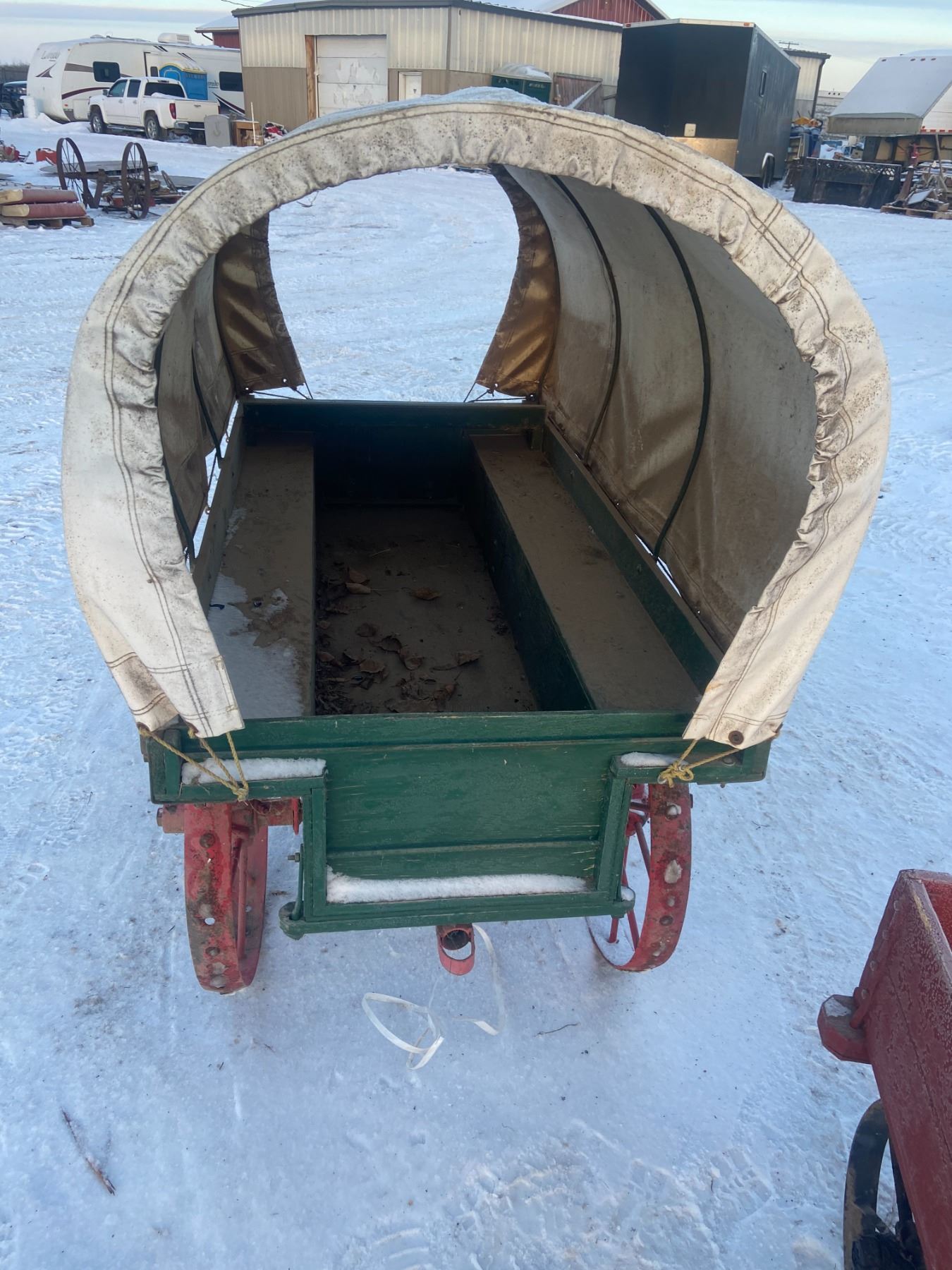 SMALL STEEL WHEEL COVERED WAGON, 8X3', 5 H, C/W POLE & EVENER