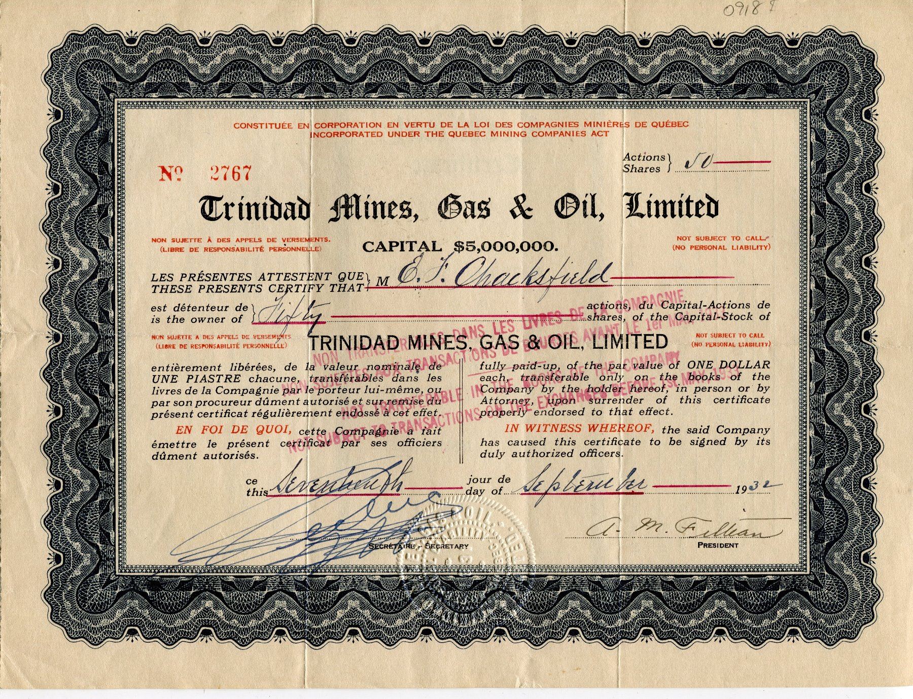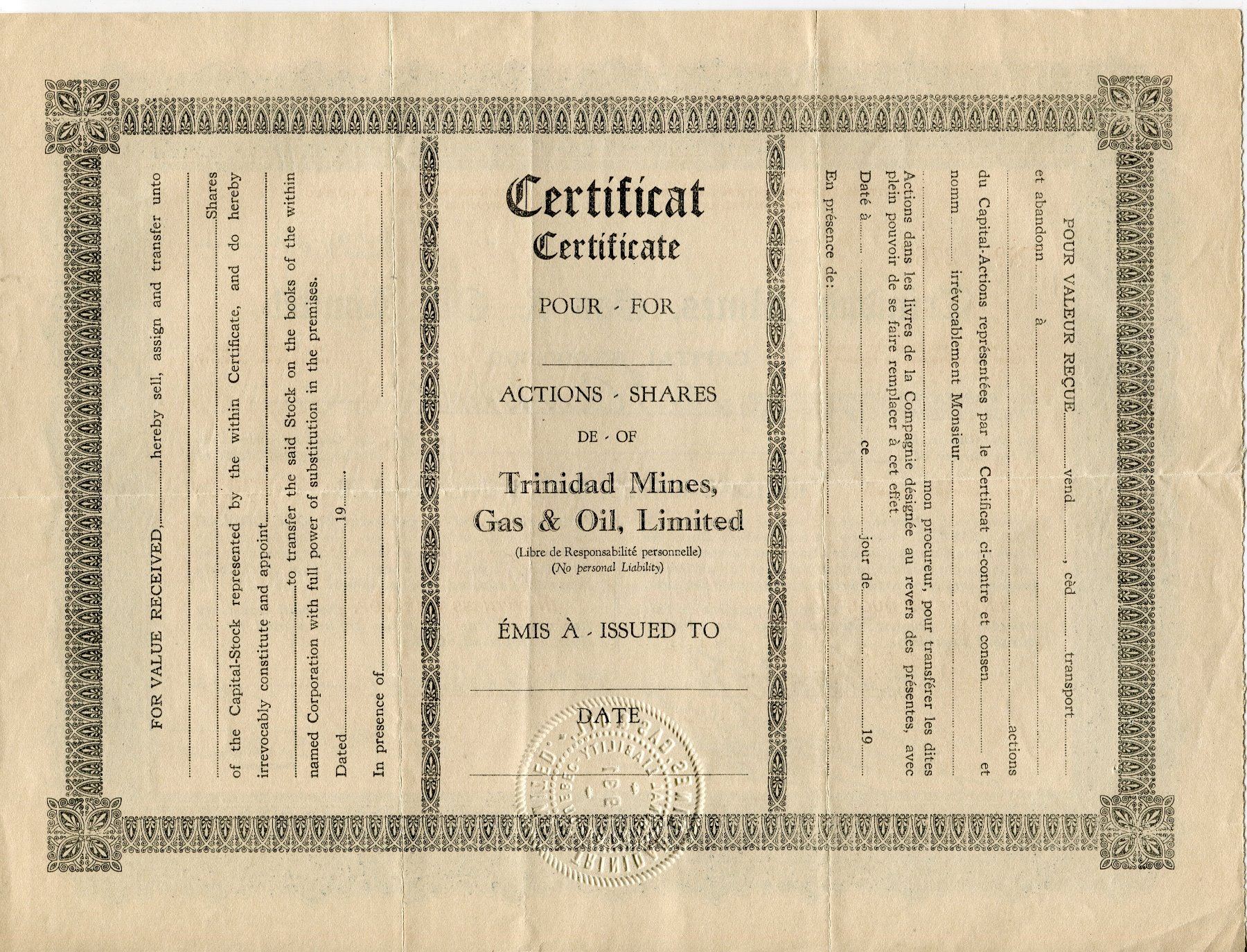 STOCK SHARES (TRINIDAD MINES, GAS & OIL LTD.) *1902*
