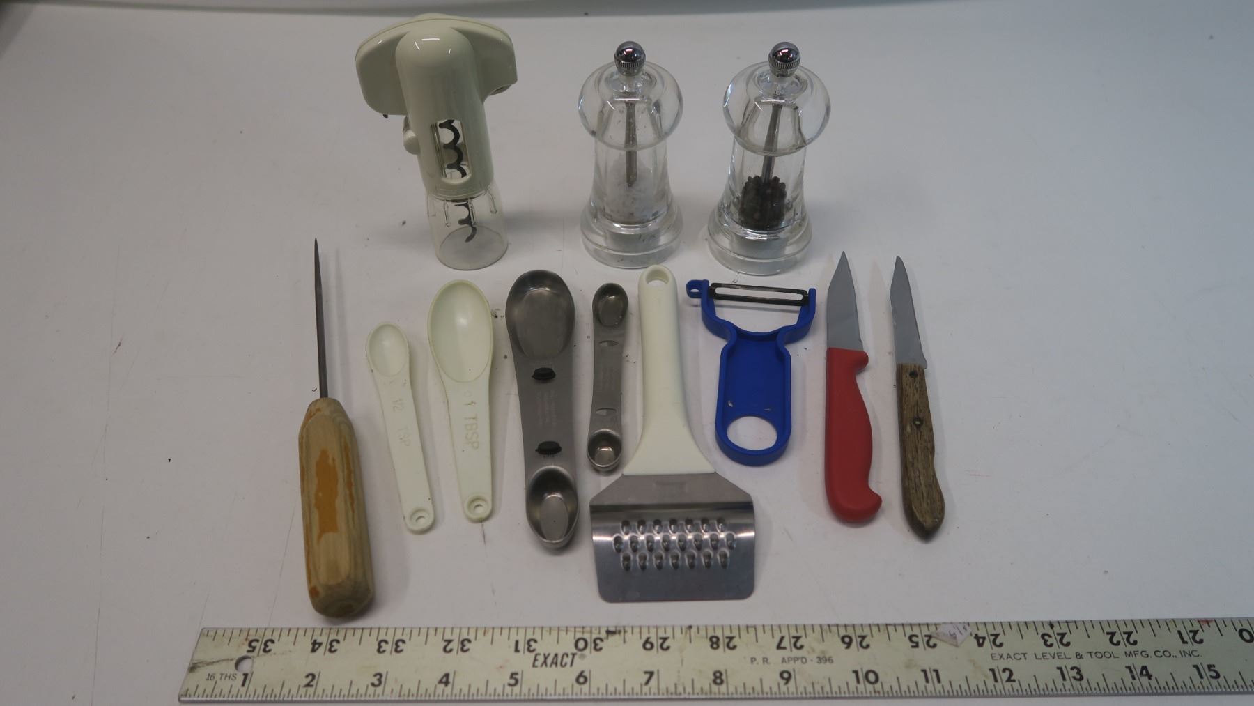 Salt & Pepper shaker & assorted kitchen utencils/measuring spoons