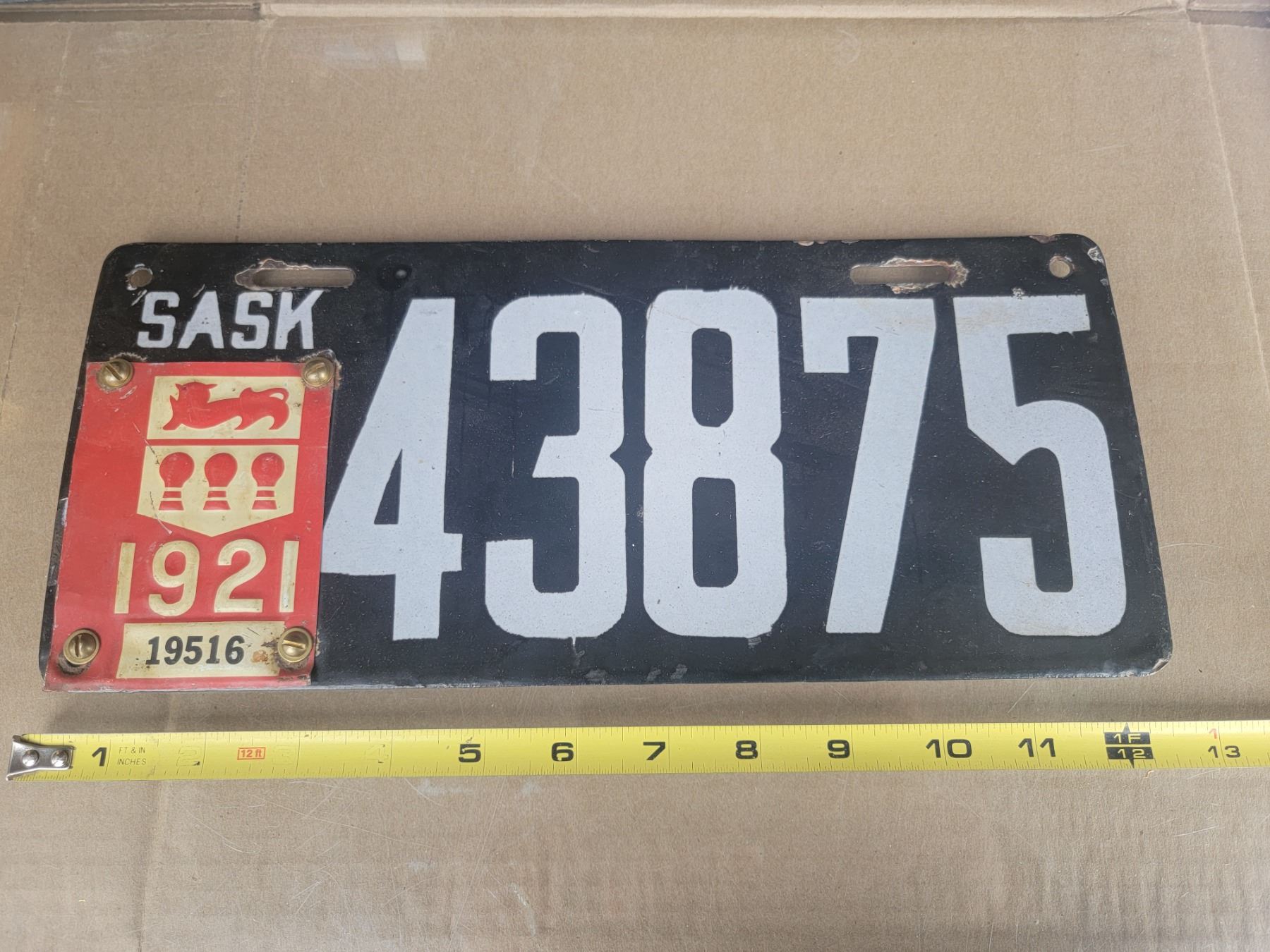 Sask 1919 porcelain license plate 43875 w/ 1921 license plate tag 19516