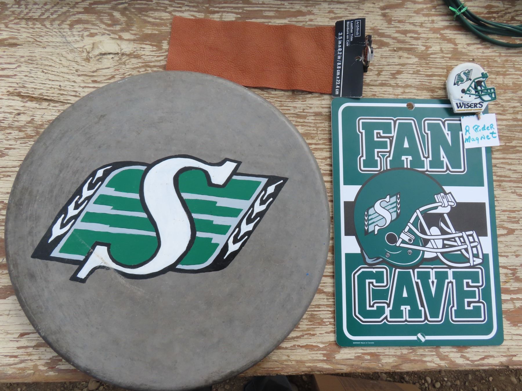 Sask. Rough rider plastic sign, Sask. Rough riders (heavy) cement piece and leather trim