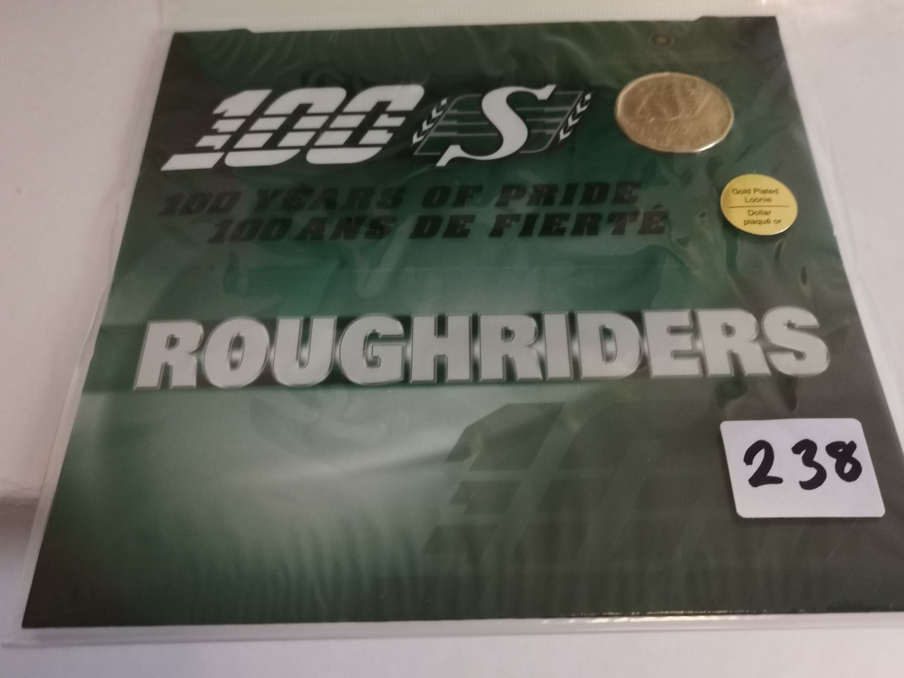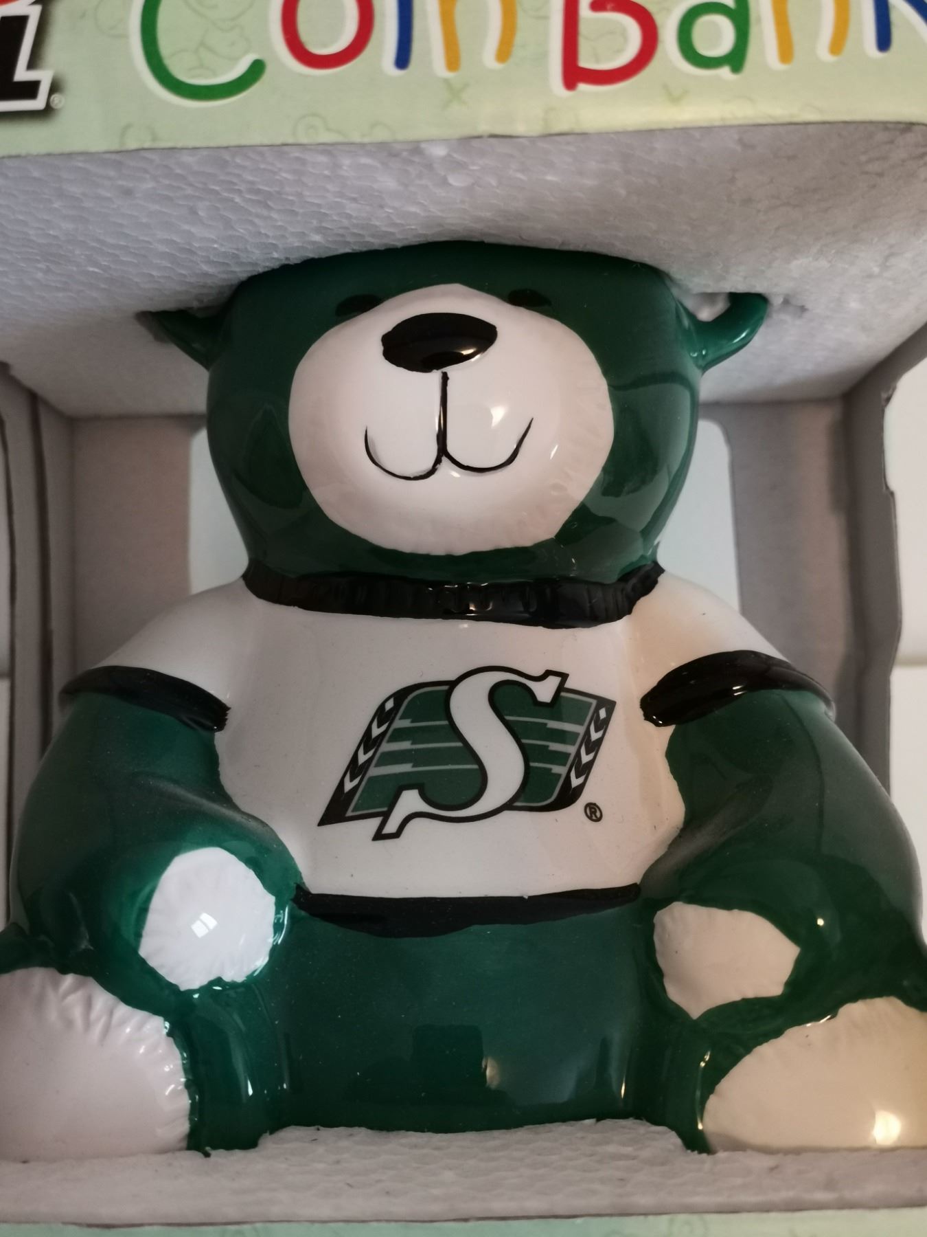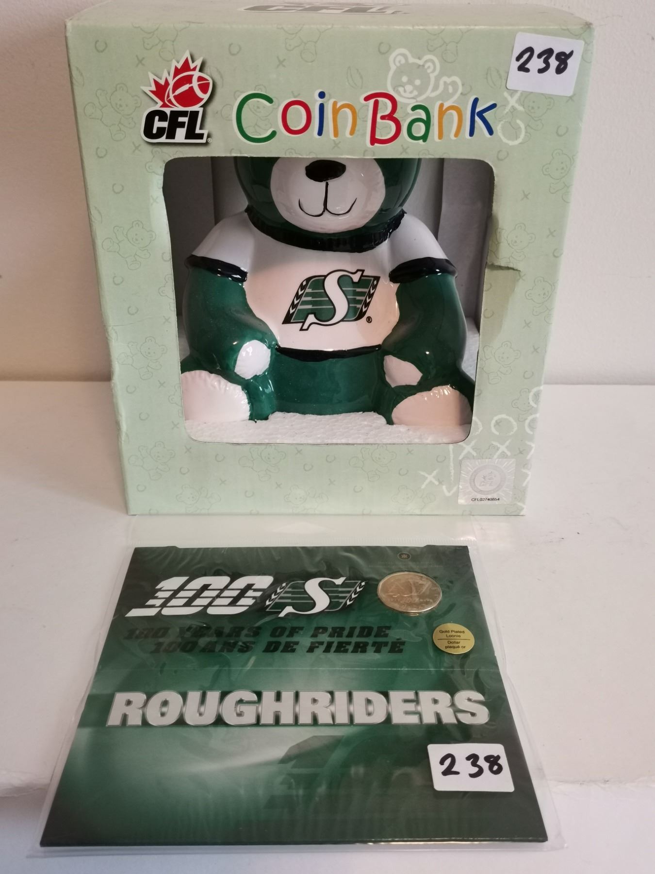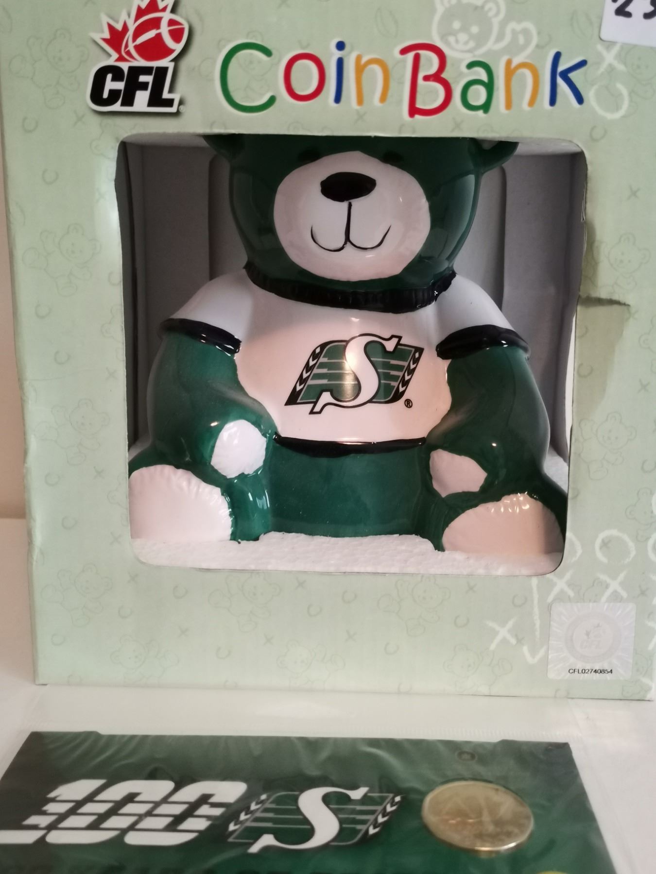 Sask Roughrider coinbank and Roughrider 1 Dollar coin