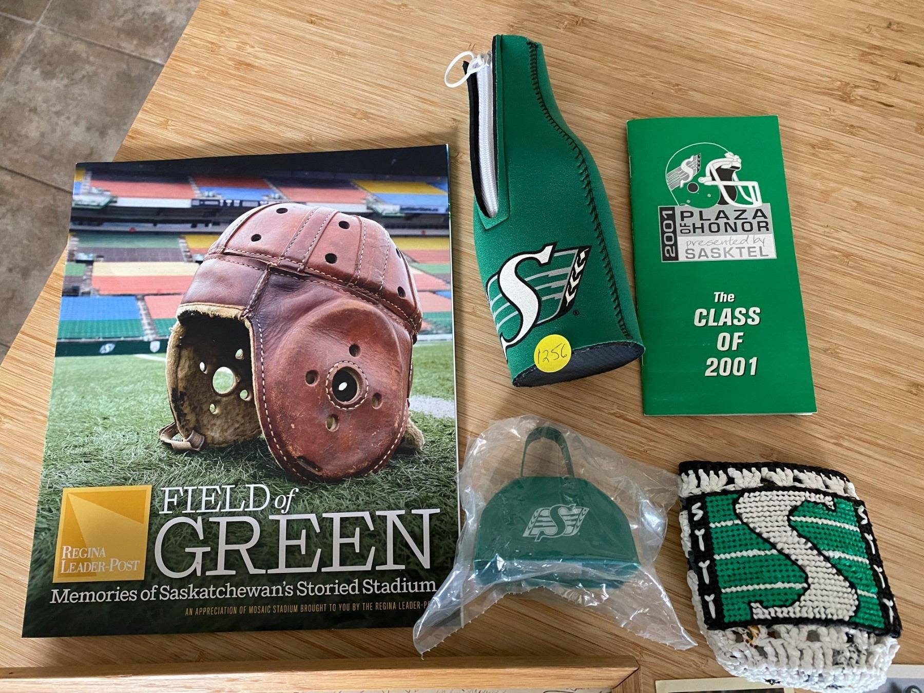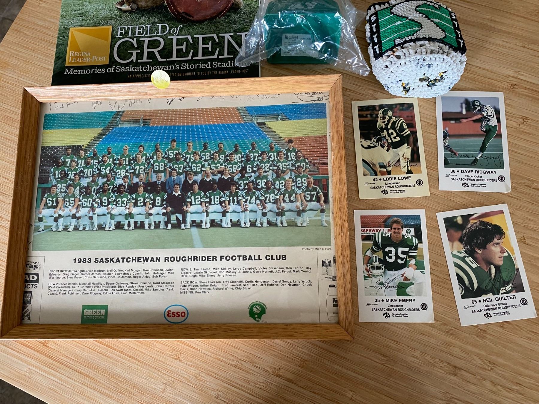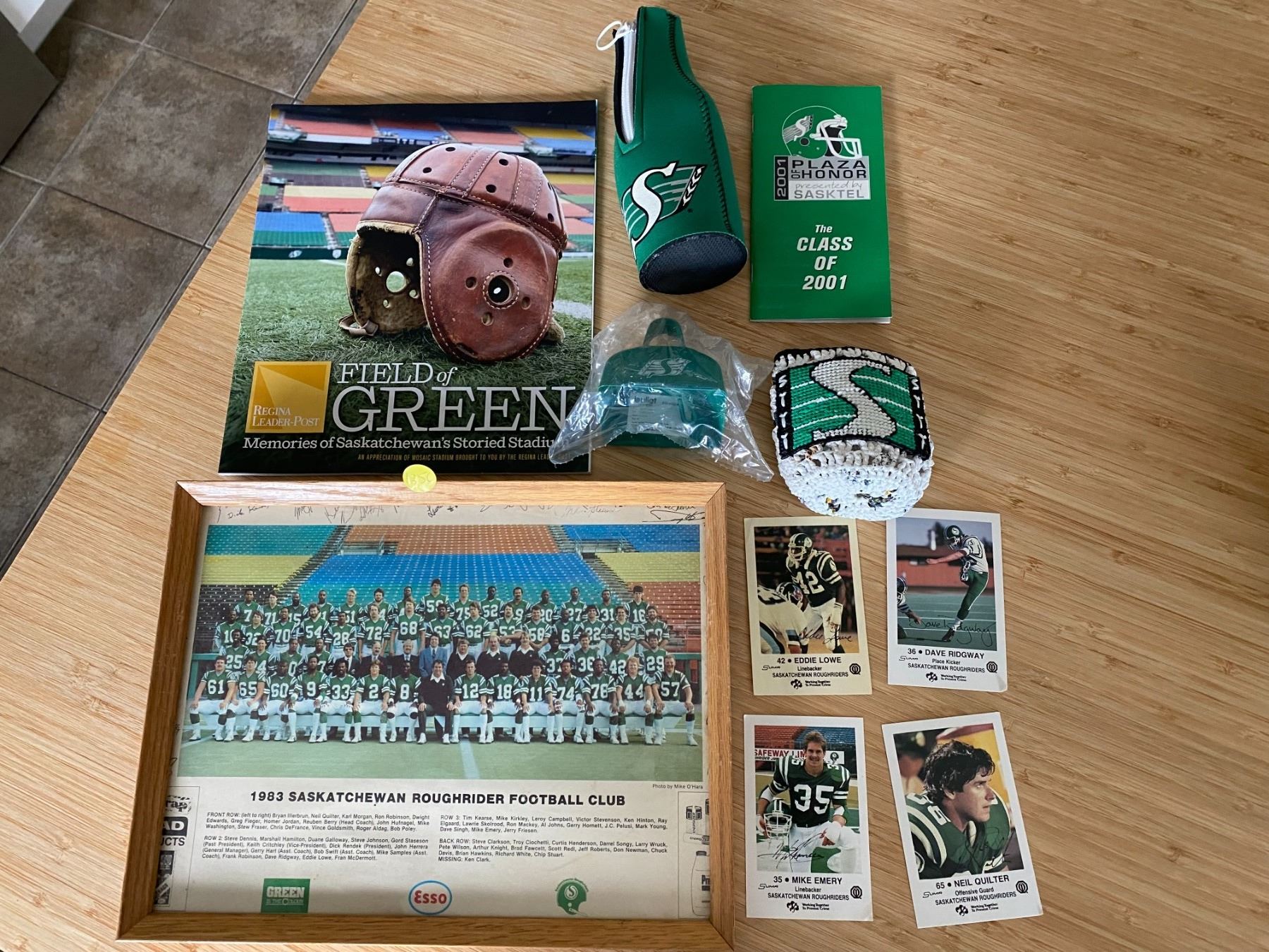 Saskatchewan Roughrider Bundle including 1983 framed team photo, drink cosies, 1980’s cards, etc.