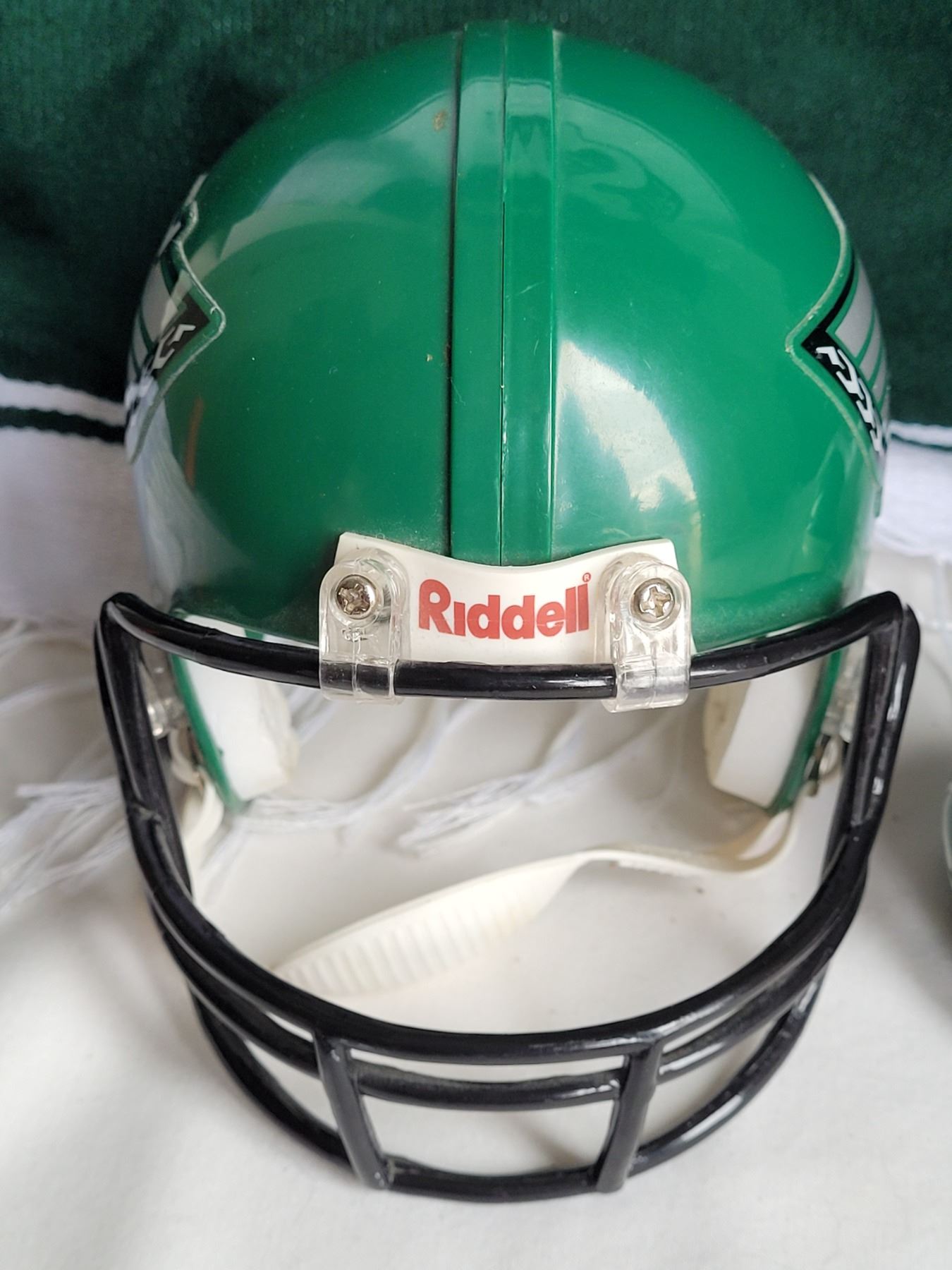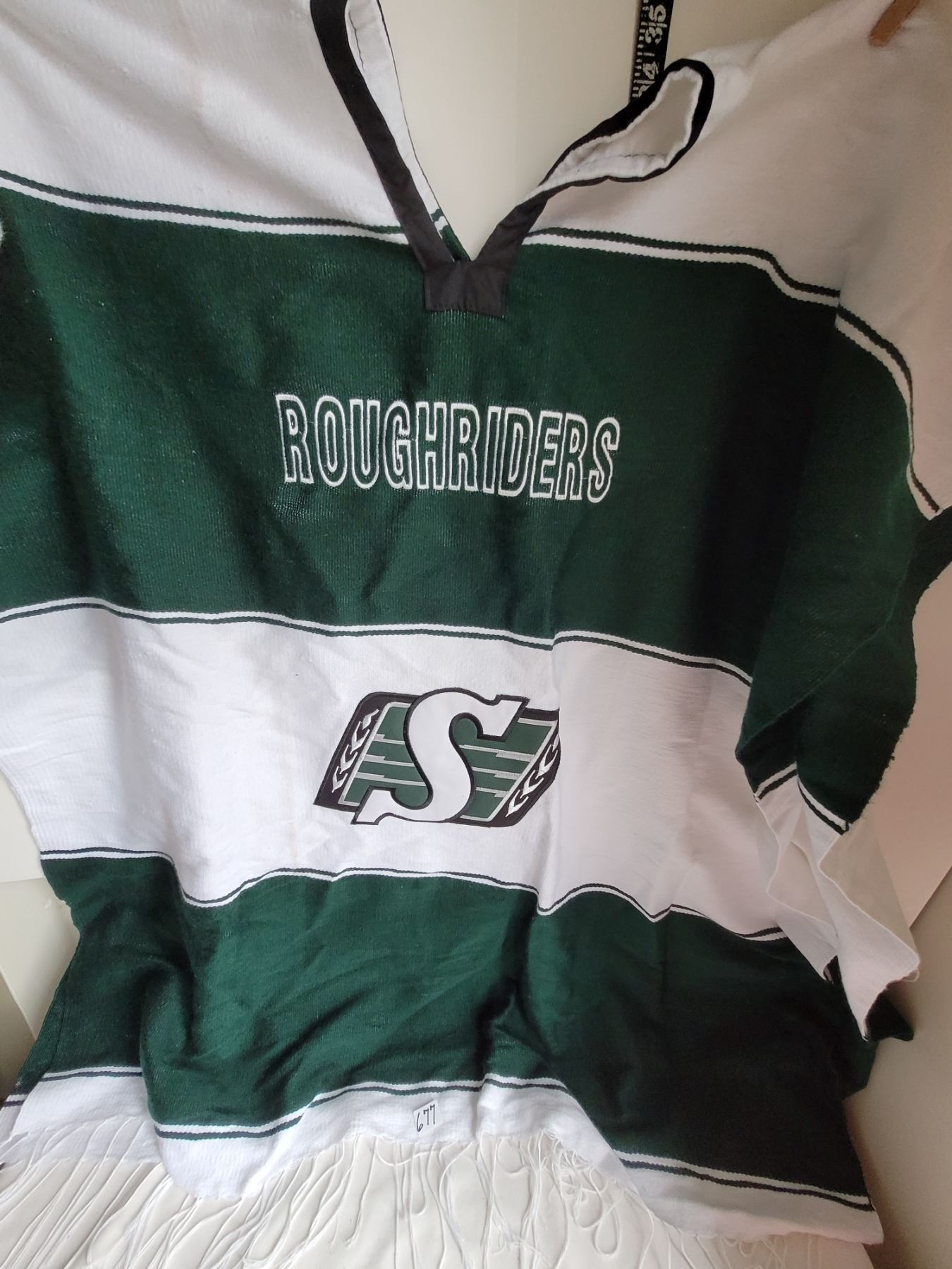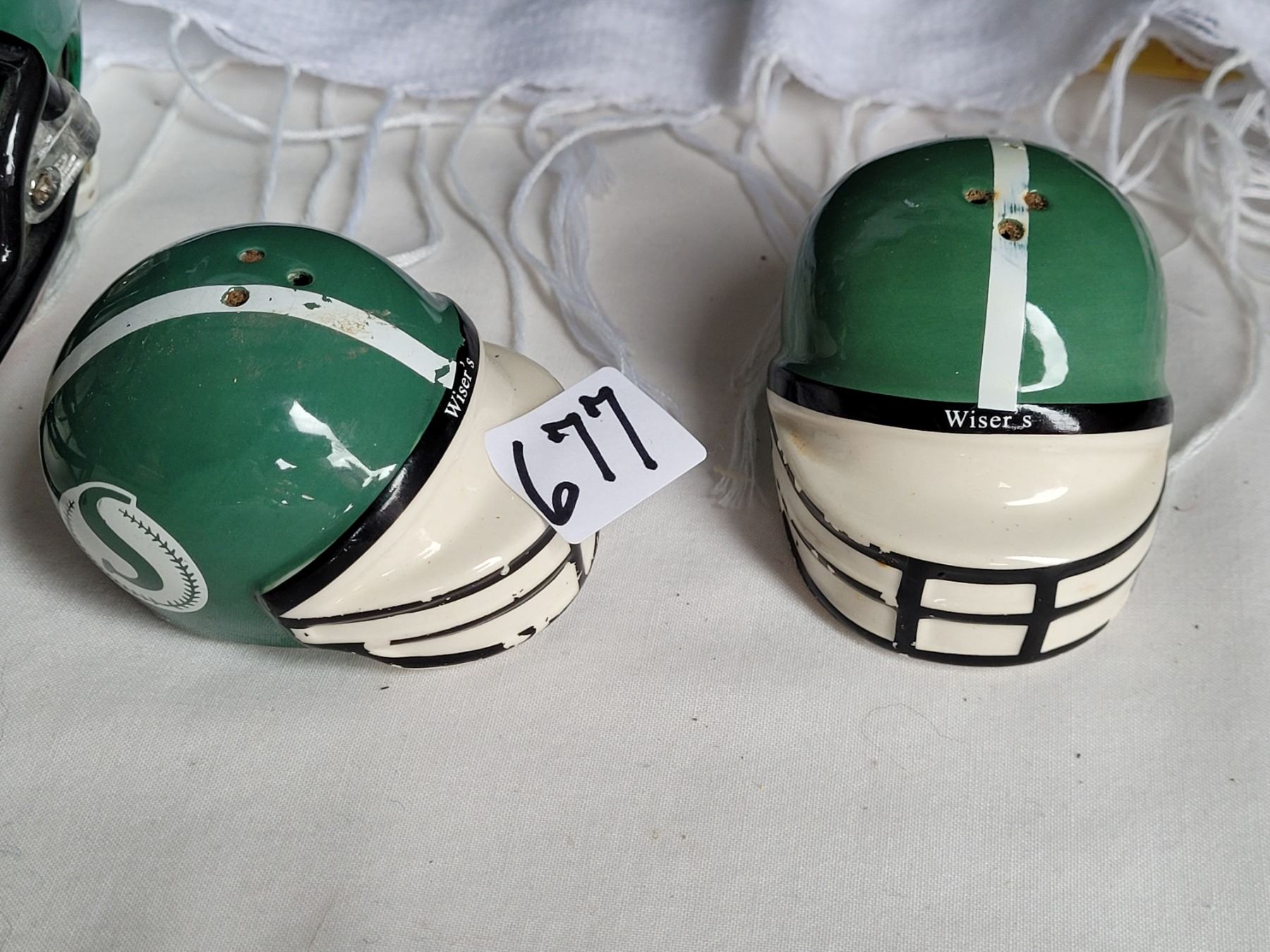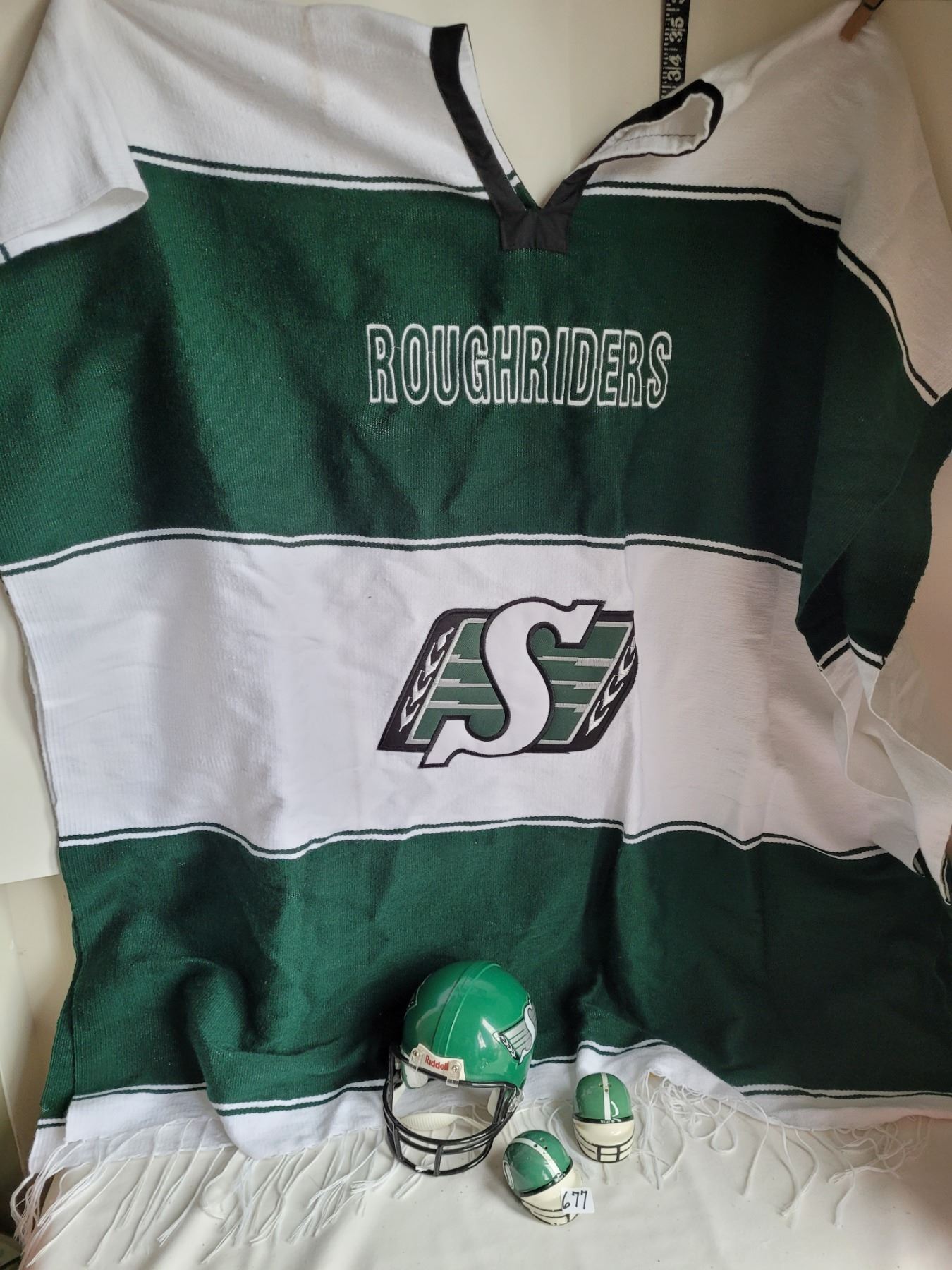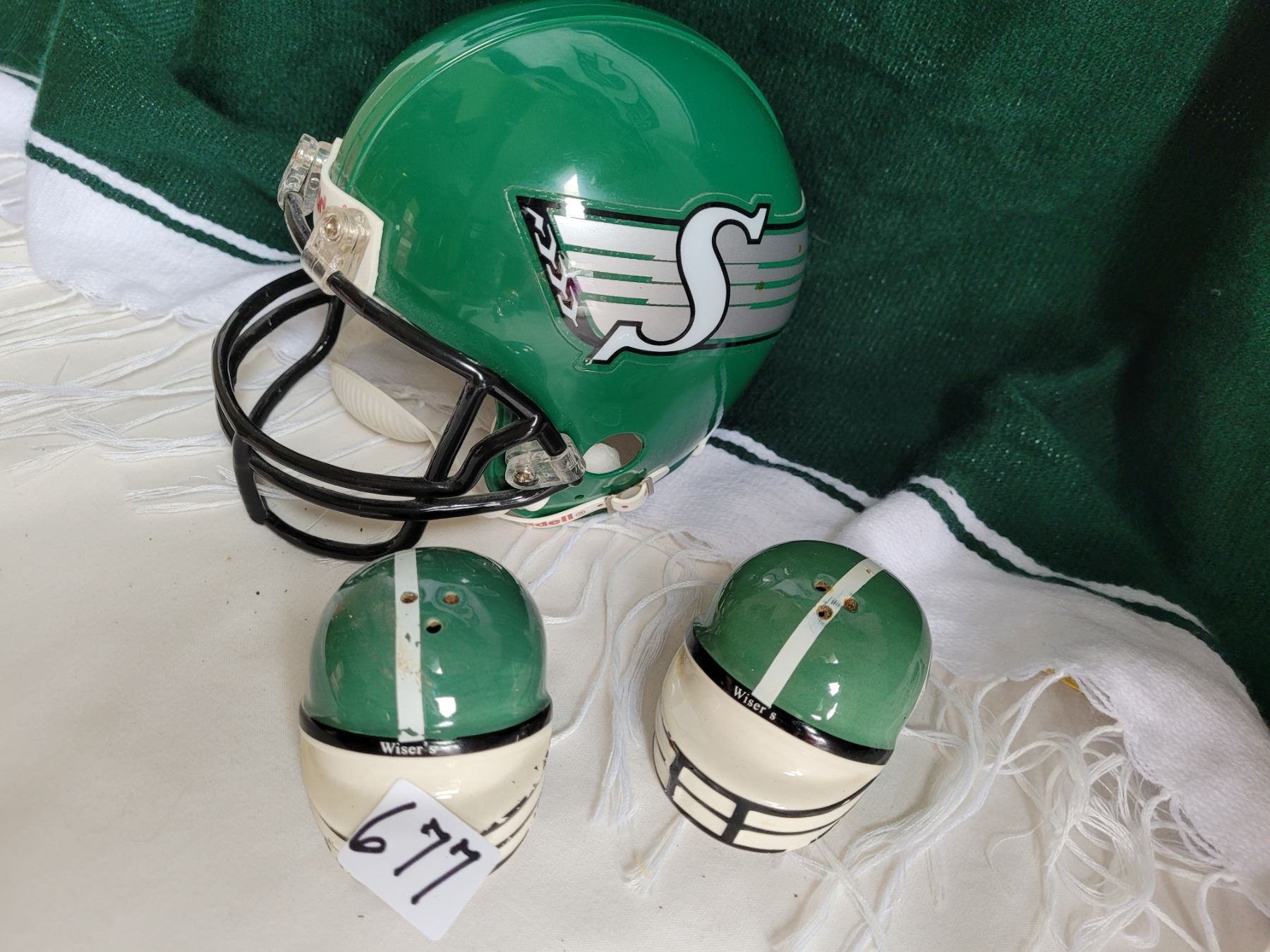 Saskatchewan Roughrider lot. Salt & pepper shakers, miniature Riddal helmet & warm poncho
