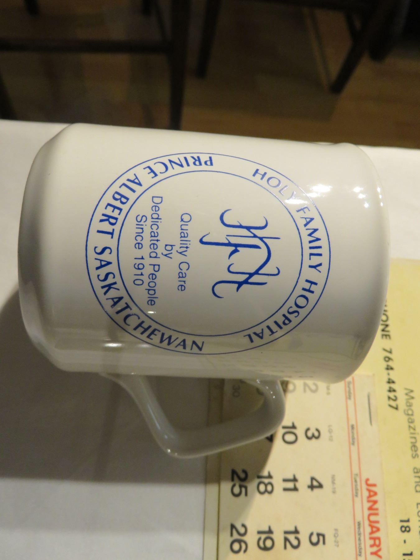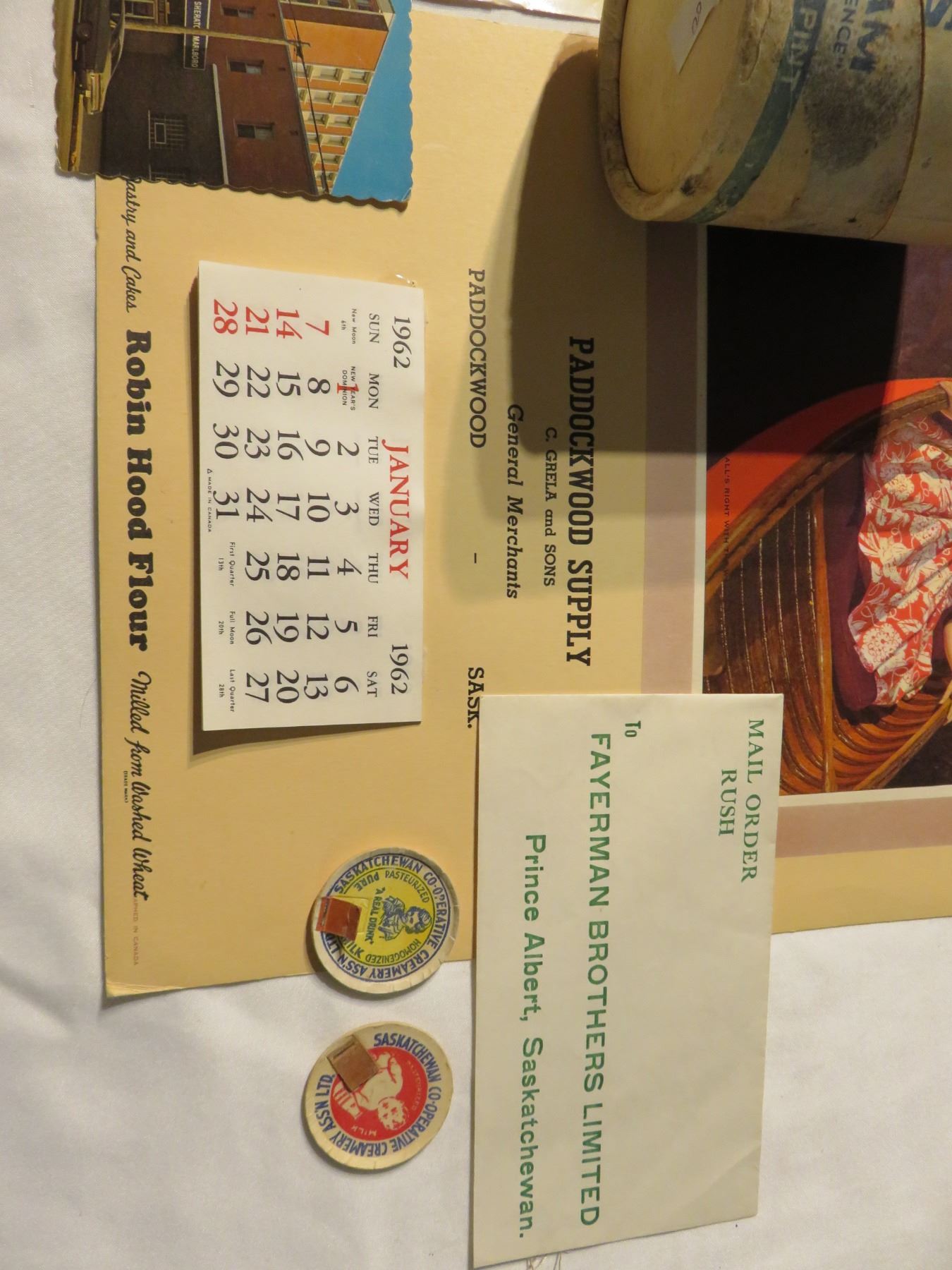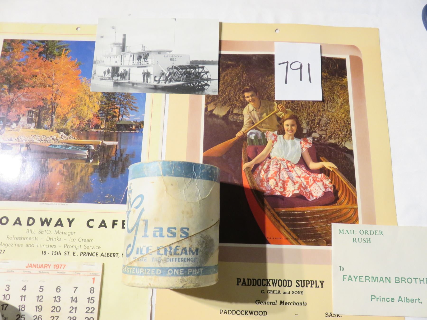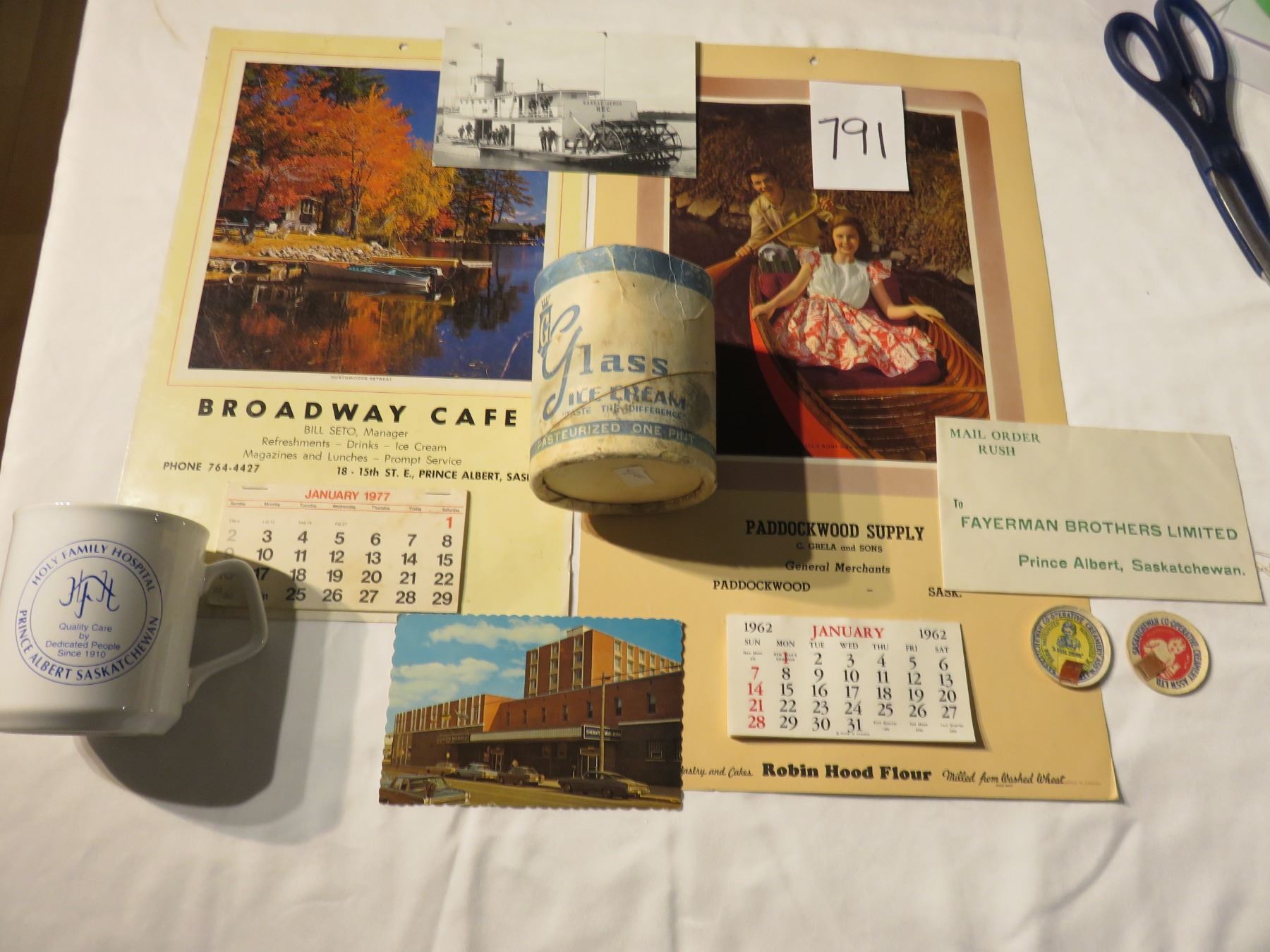 Saskatchewan collectibles - Holy family hospital cup; Paddockwood & Broadway café calendars, Glass dairy ice cream (rare); Malboro Hotel postcard; milk bottle caps