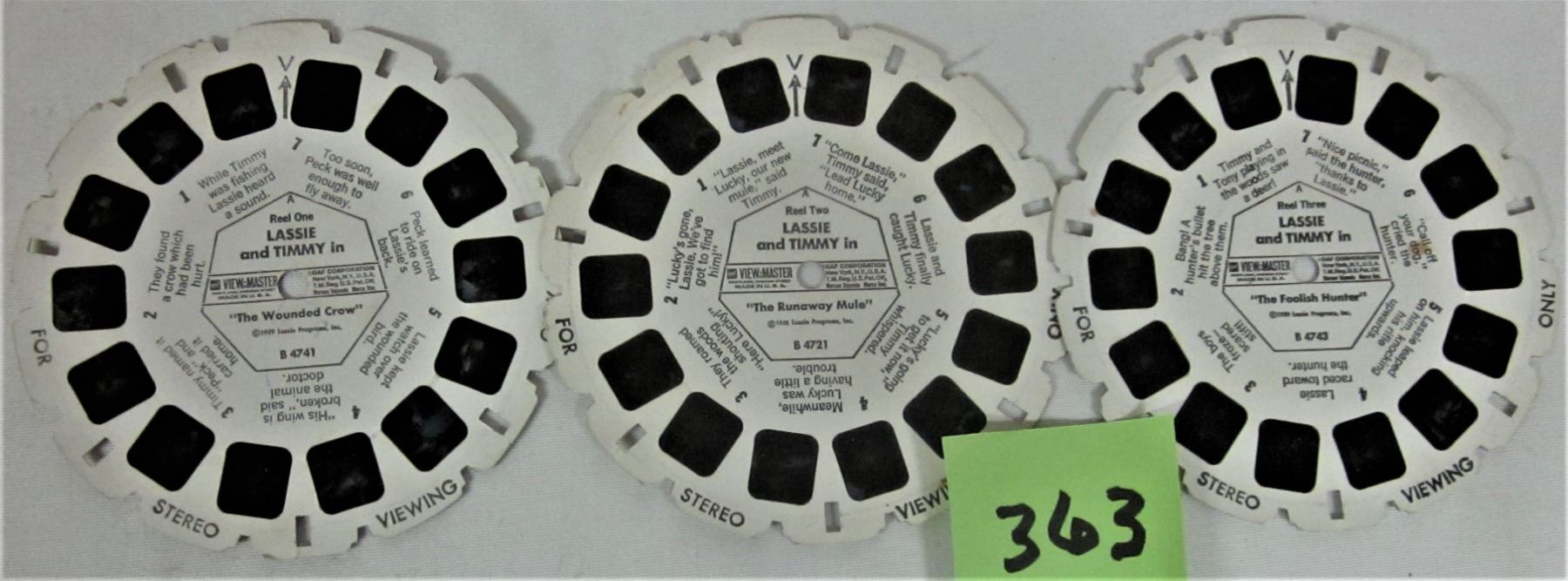Sawer Viewmaster 3D Reels 1958 Lassie + Timmy "Runaway Male", "Wounded Crow", "Foolish Hunter"