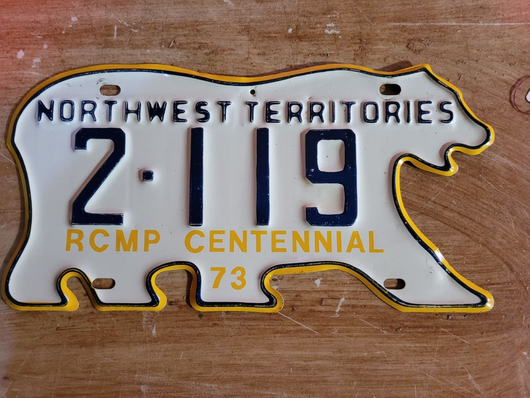 Scarce 197 NWT RCMP centennial license plate 3 colors on plate