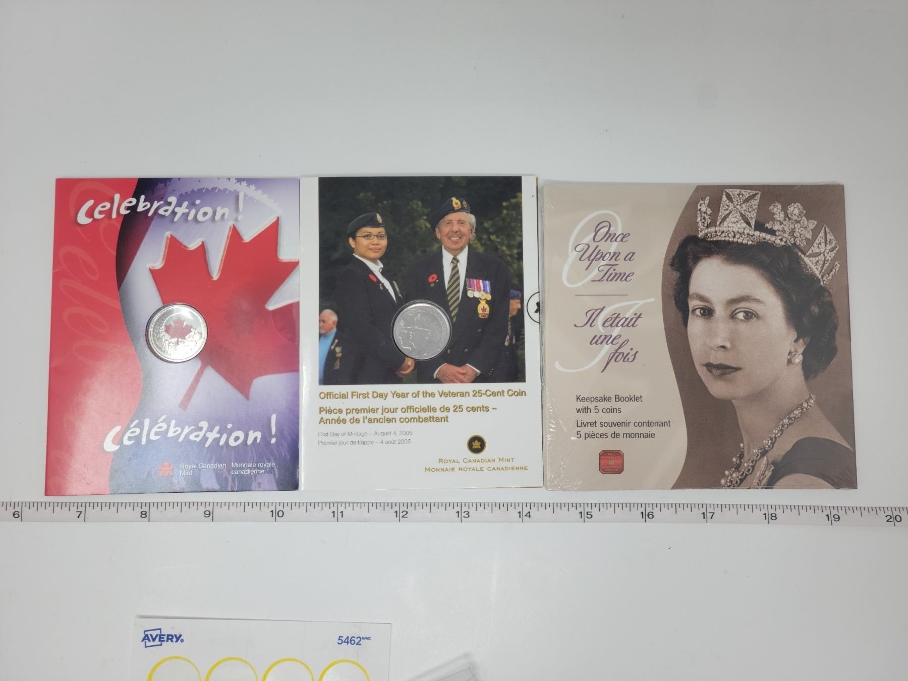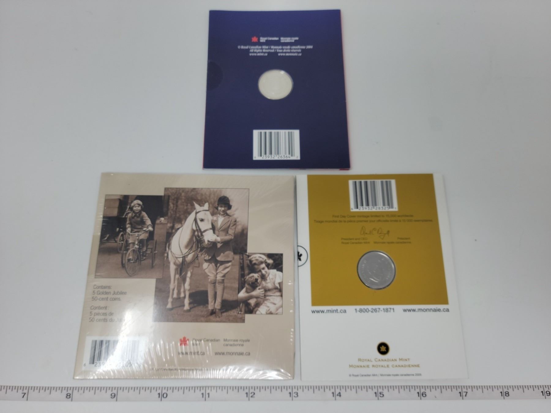 Sealed 5 Golden Jubilee 50 cent coins, veteran 25¢ coin, Celebration 25¢ coin.