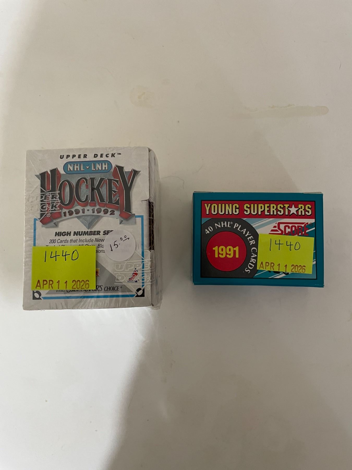 Sealed box of 1991-92 upper deck high series hockey cards and 40 young superstars score hockey cards 1991