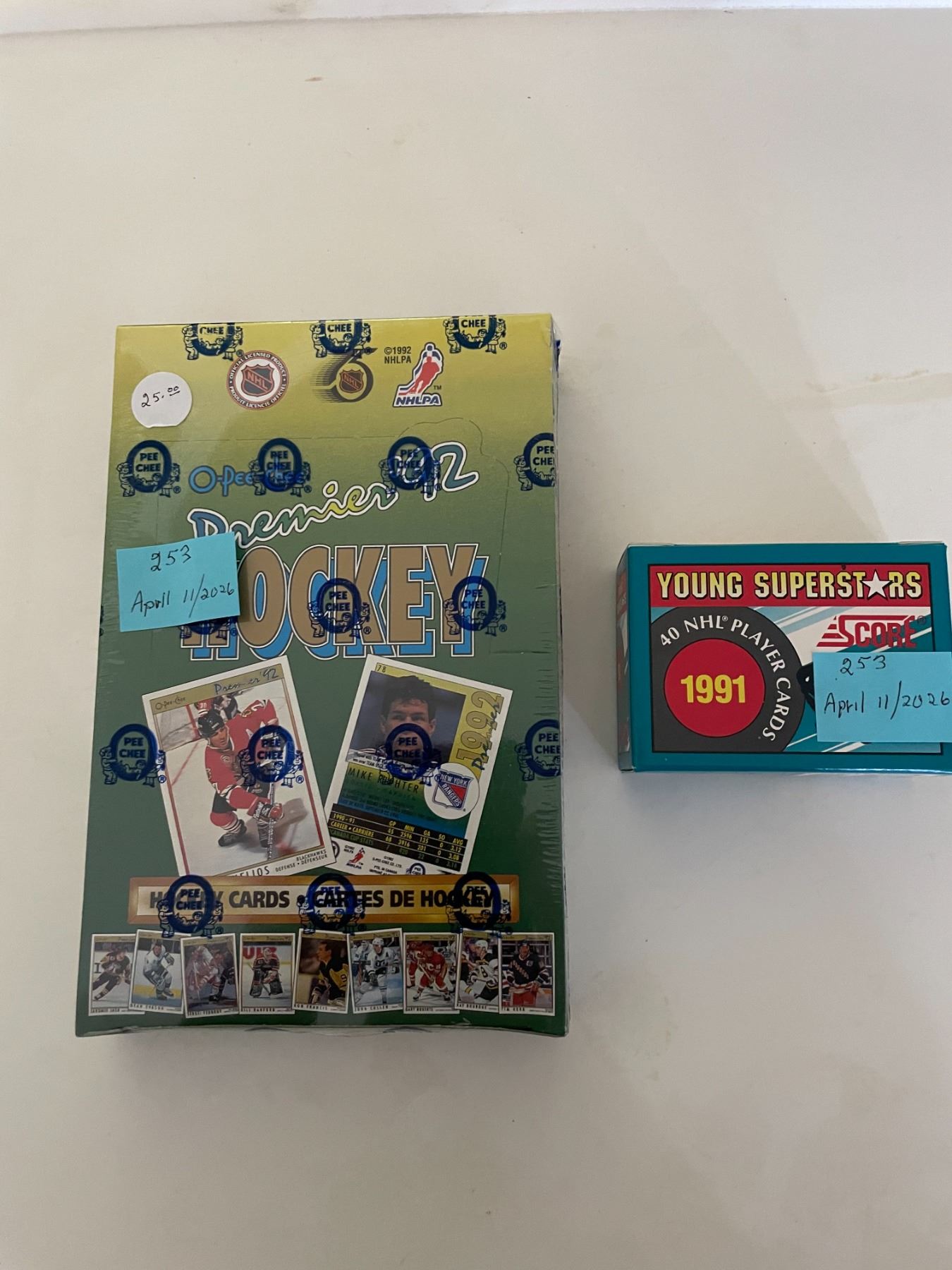 Sealed box of O-P-Chee premier 1992 hockey cards and box of 40 young super stars score hockey cards