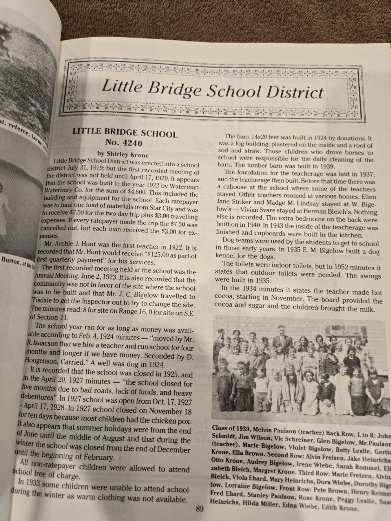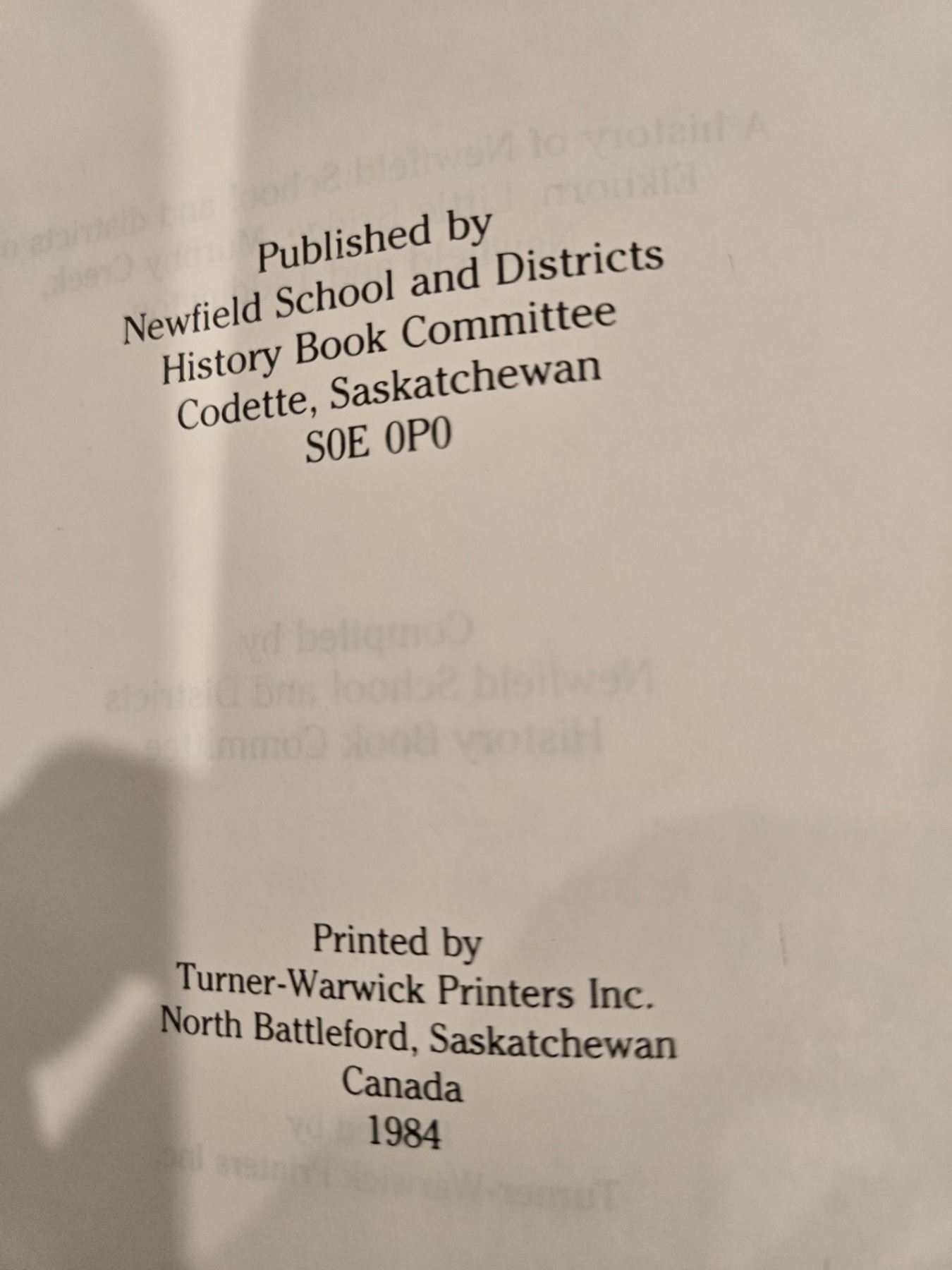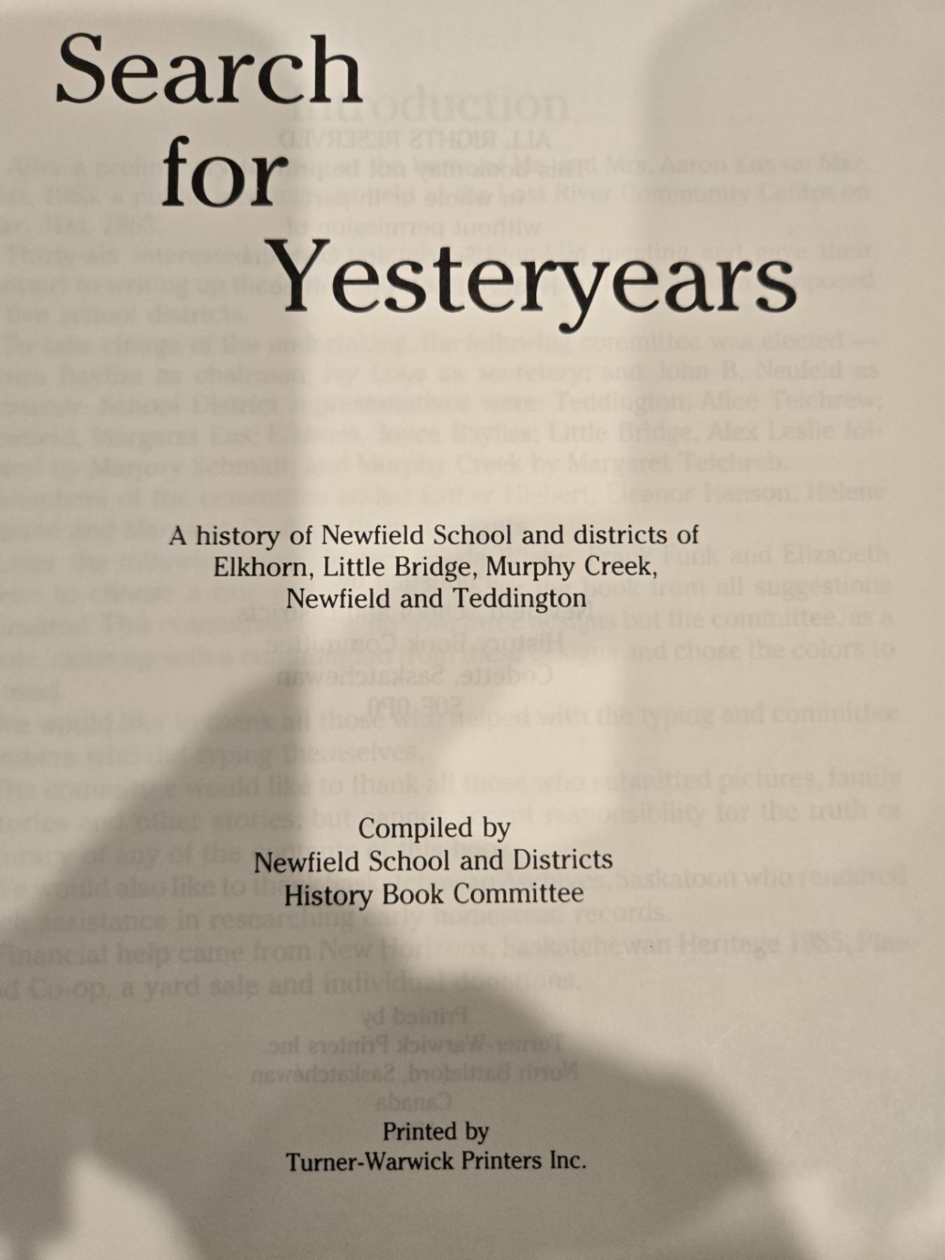 Search for Yesteryears, Saskatchewan history book. A history of Newfield School and districts of Elkhorn, Little Bridge, Murphy Creek, Newfirld and Teddington. Printred in 1982.476 pages