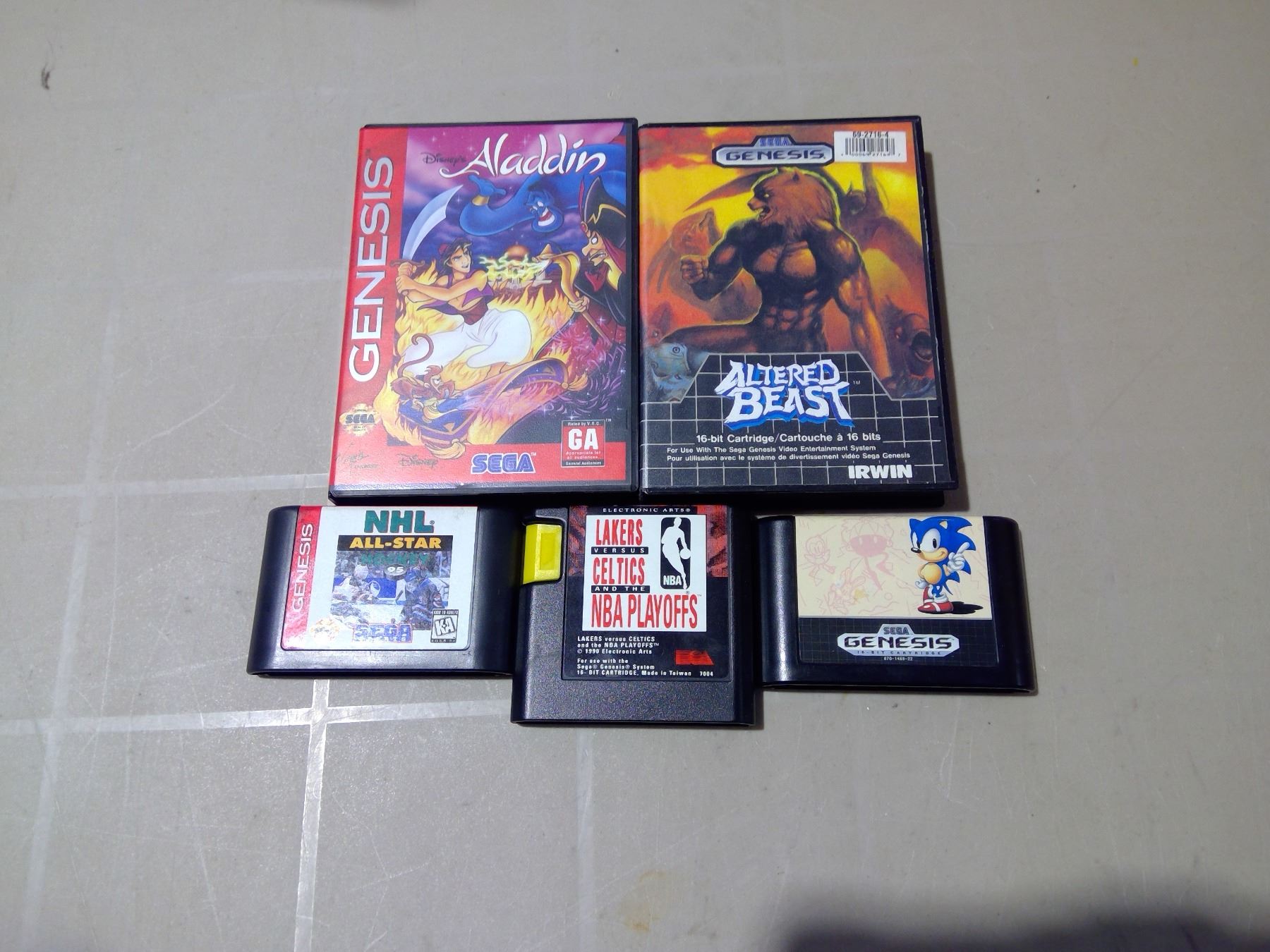 Sega Genesis games Aladdin, Altered Beast, NHL All-Star Hockey, Lakers vs. Celtics and Sonice the Hedgehog