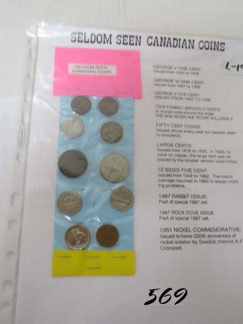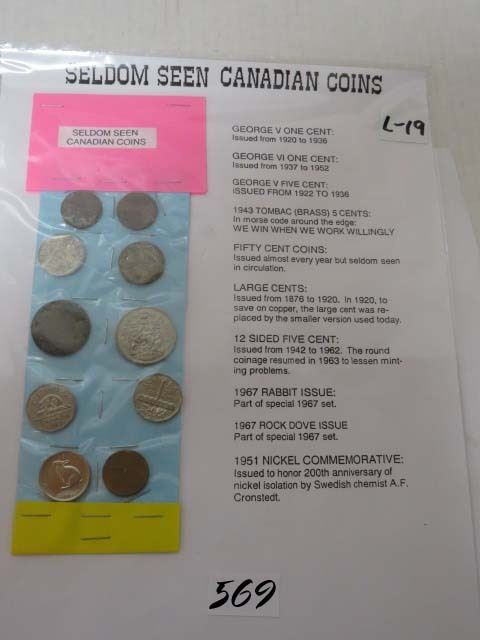 Seldom seen Cndn coins George V 2 pennies 1920 & 1936, 1 1943 Tombac brass nickel, 1 50 cent piece 1969, 1 1920 large penny, 2 12 sided nickels 1951 & 1959, 1 1967 Rabbit nickel, 1 1933 Nickel, 1 1967 Dove penny