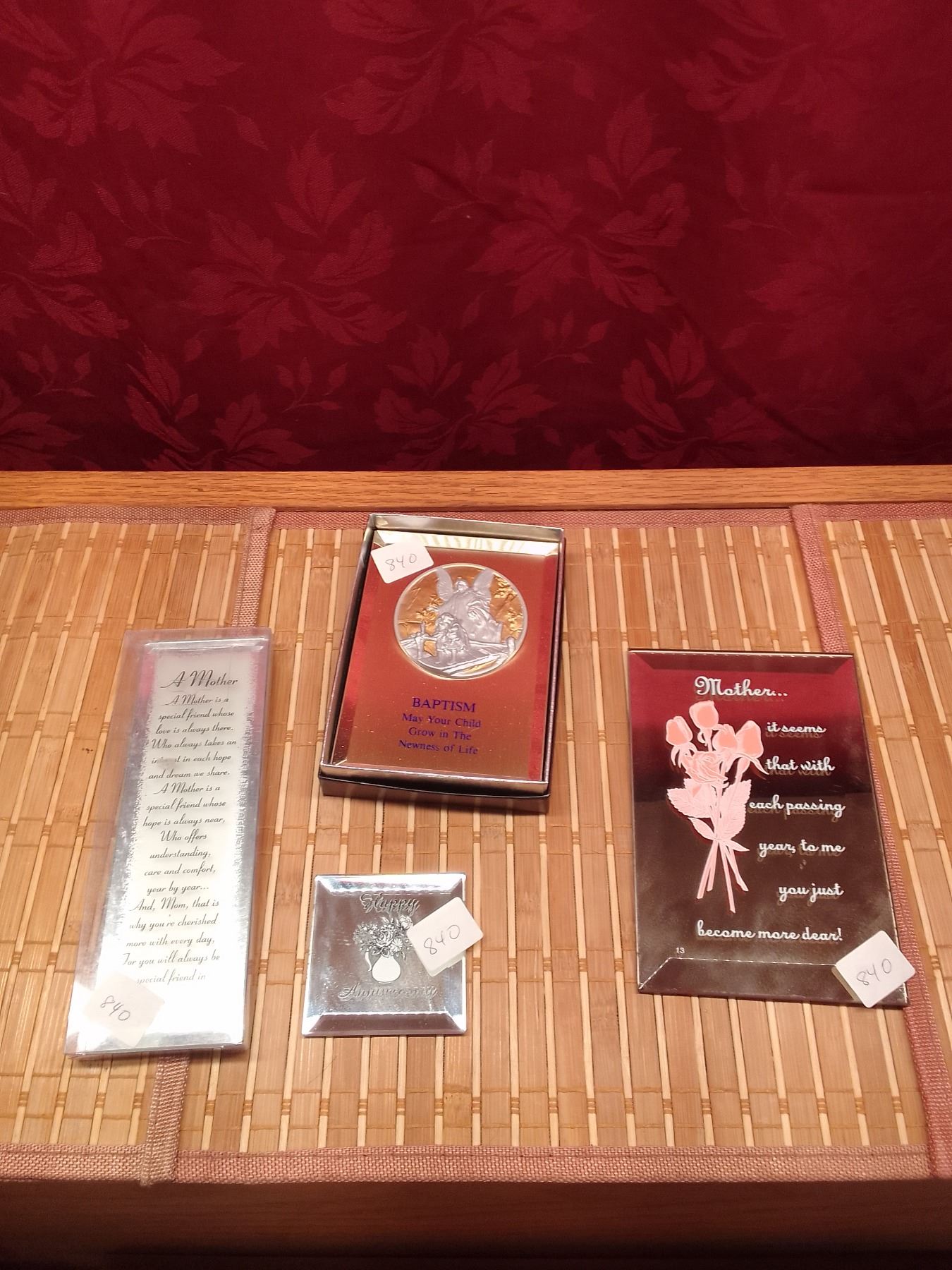 Sentimental Mother & Baptism Plaques Collection- Four framed keepsakes: two heartfelt "Mother" poems on mirrored glass, a Baptism plaque with silver guardian angel medallion, and a small silver-tone trinket dish. Ideal gifts for cherished memories.