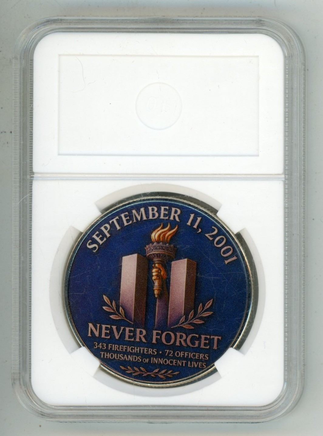 September 11, 2001 Twin Towers Colourized Memorial Medal. Housed in a hard plastic holder. BU.