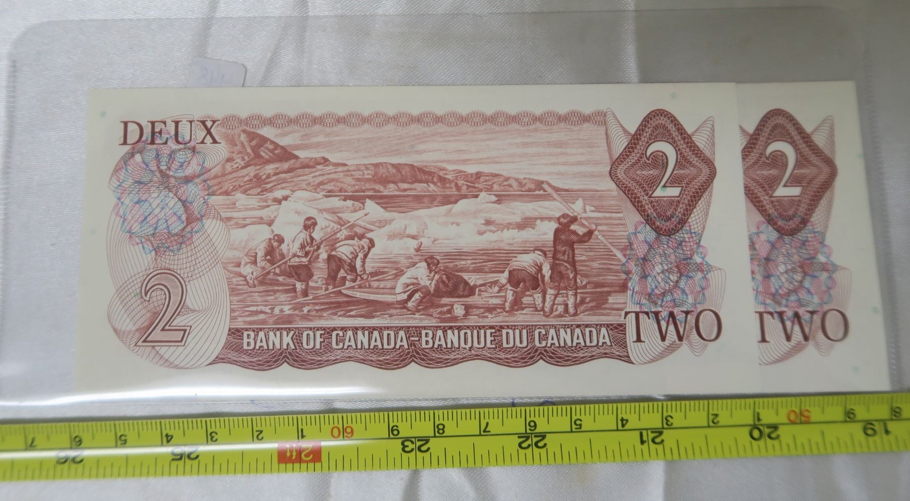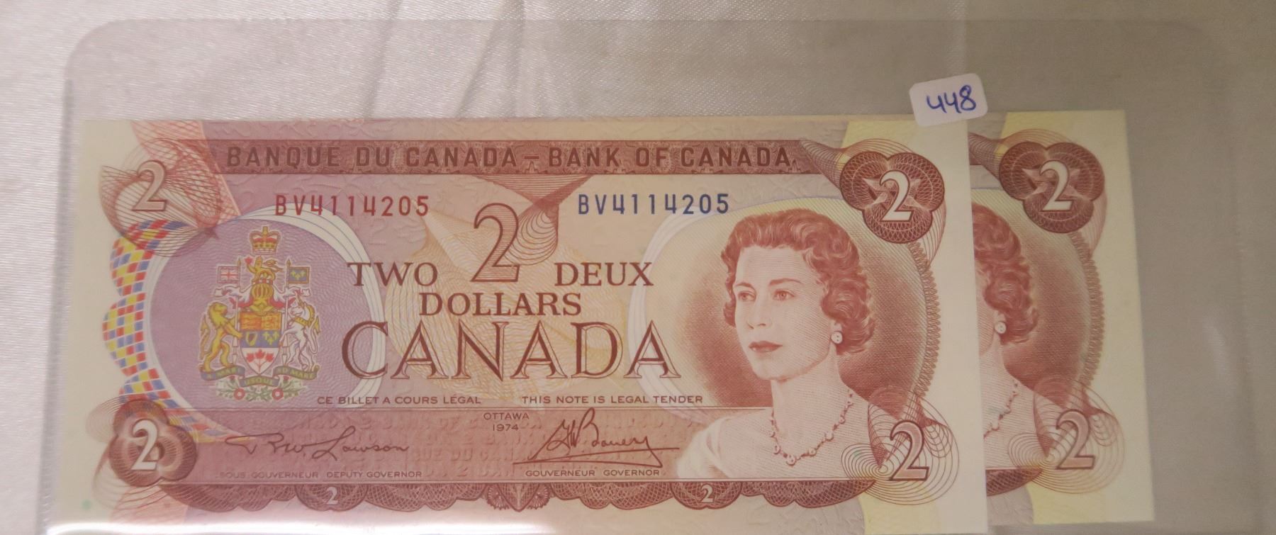 Sequential Pair of UNC 1974 Canada $2 bills, Lawson/Bouey, #BV 4114205 - 206