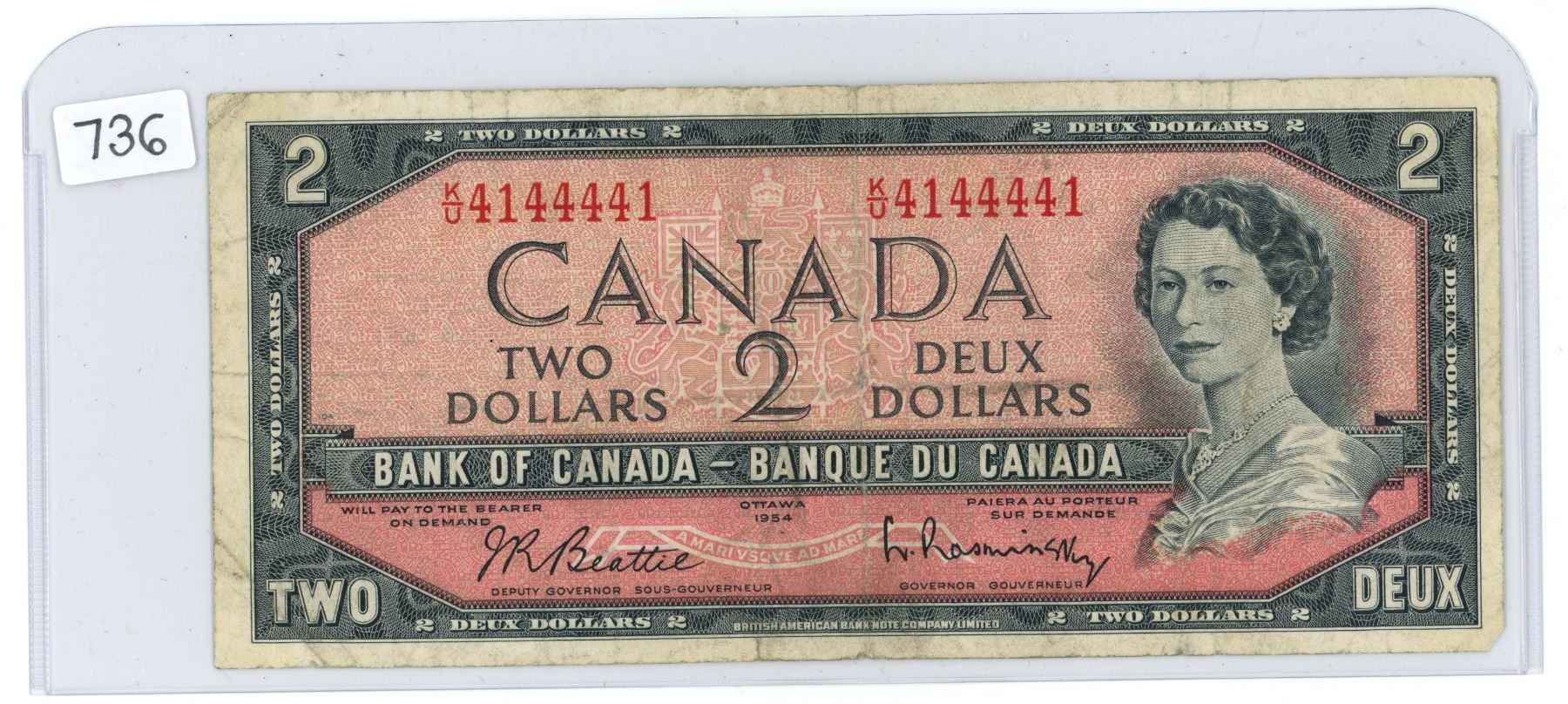 Serial # K/U 4144441, canada 1954 $2 bill, Beattie/ Rasminsky