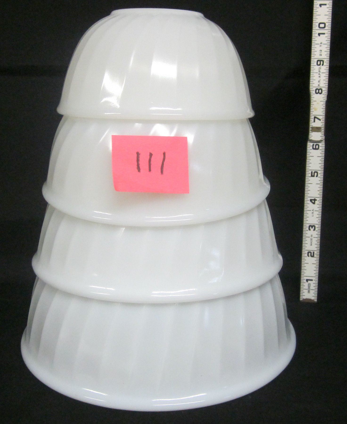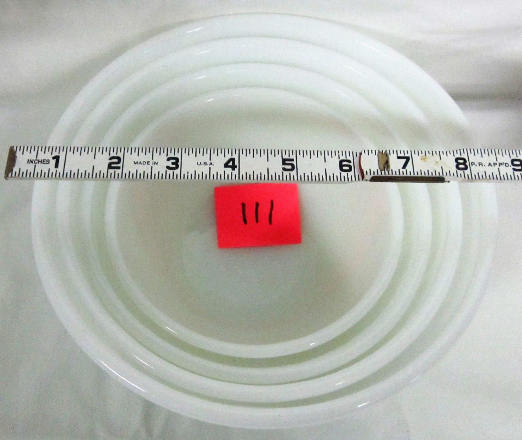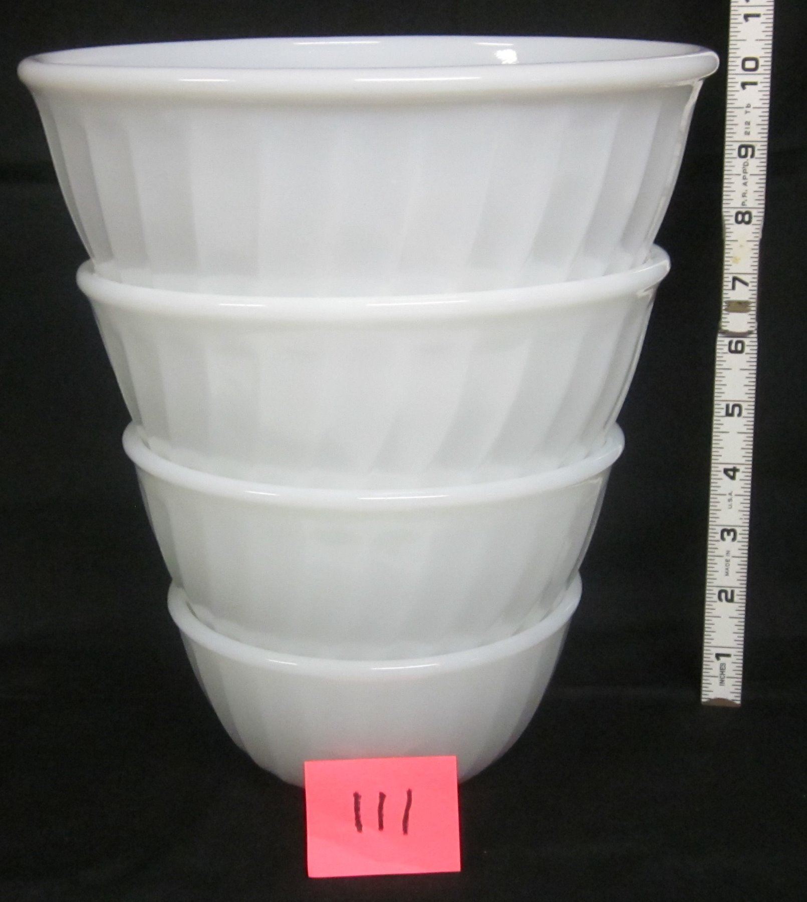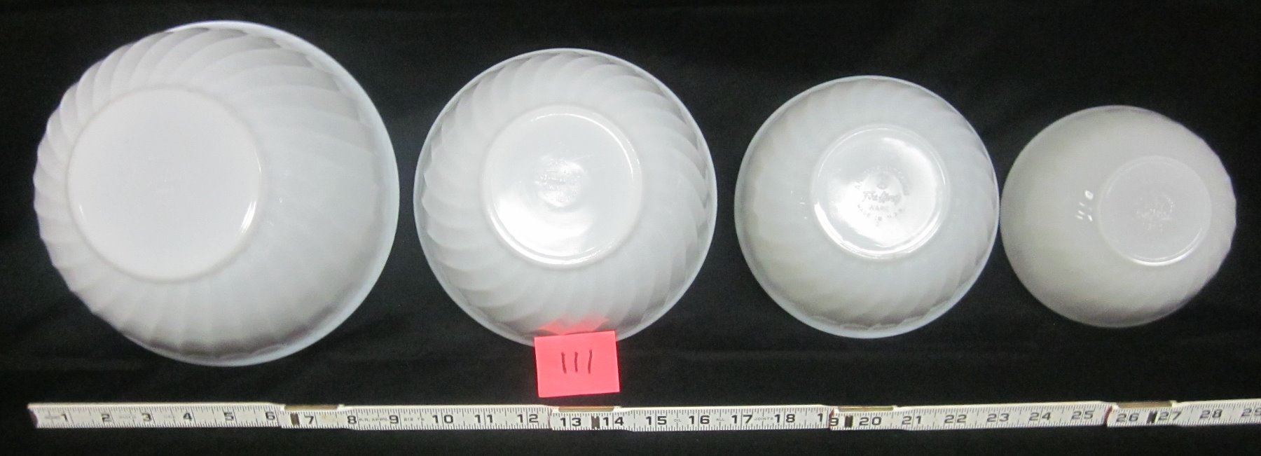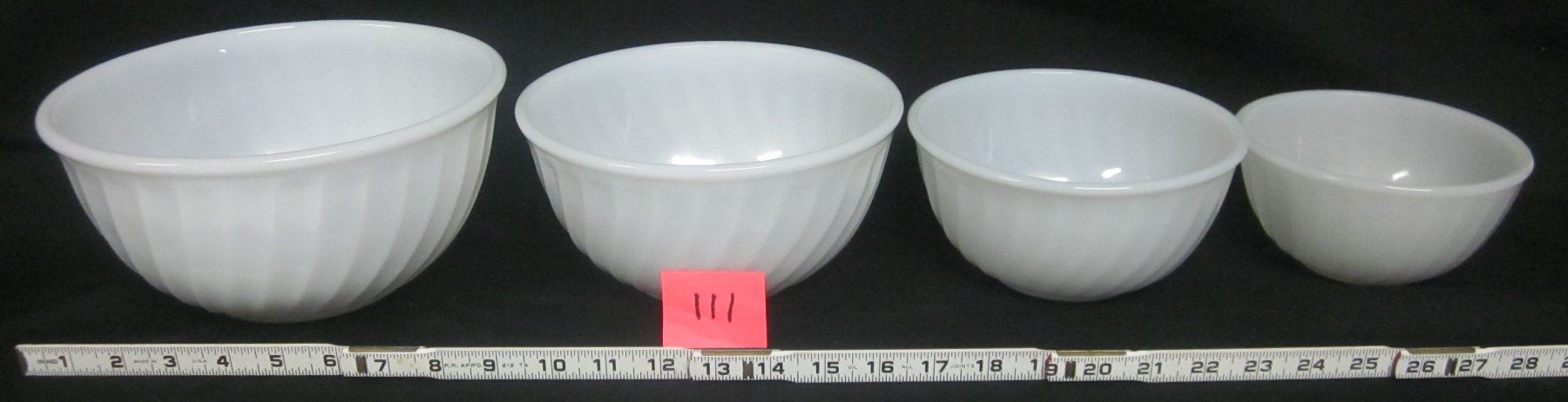 Set 4 6" 7" 8" 9" vintage white swirl pattern Fire King nested mixing bowls