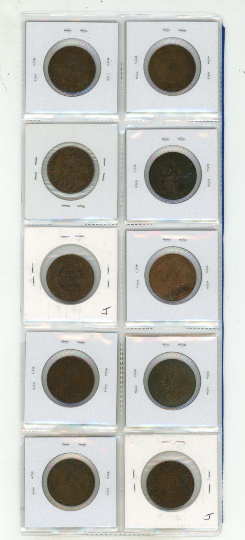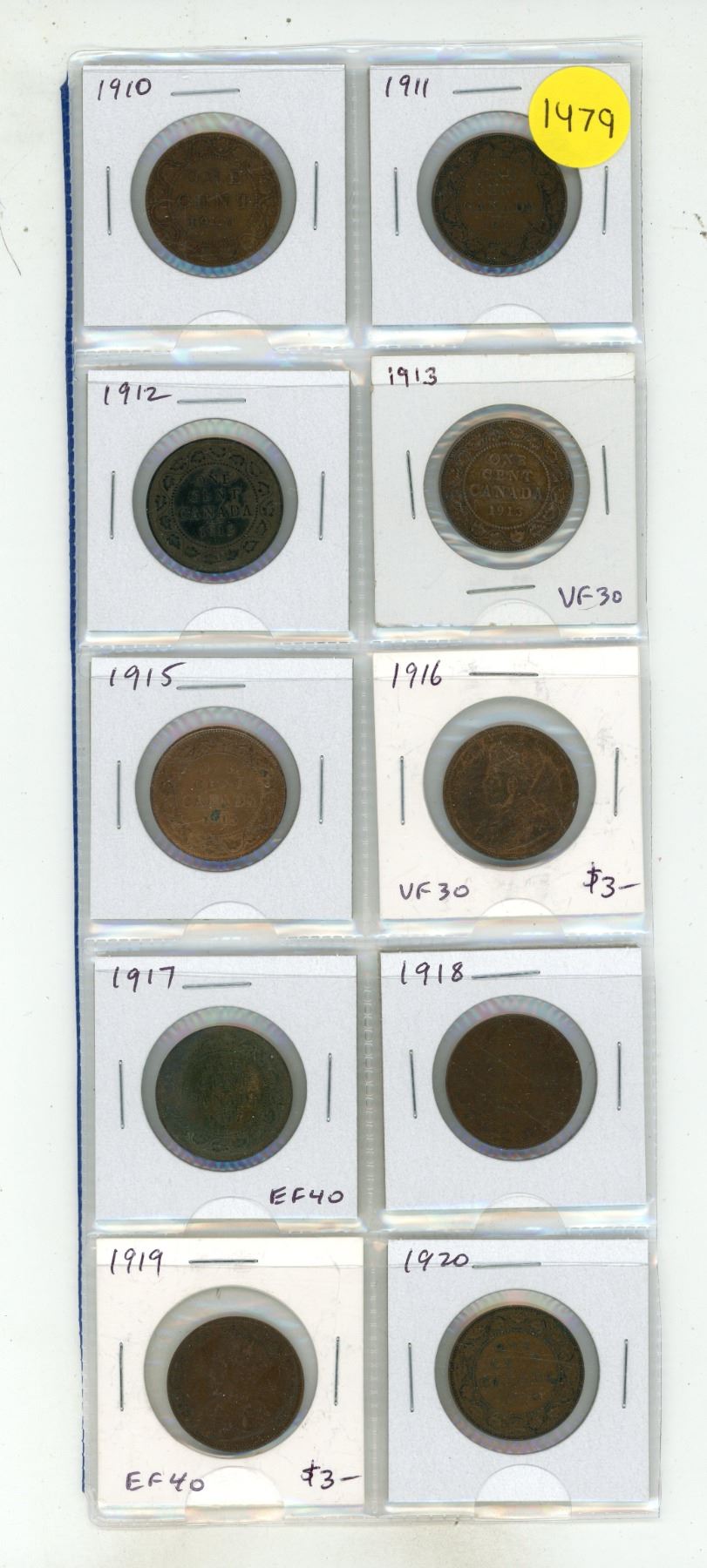 Set of 10 Canadian Large Cents from 1910 to 1920. Coins grade up to EF40.